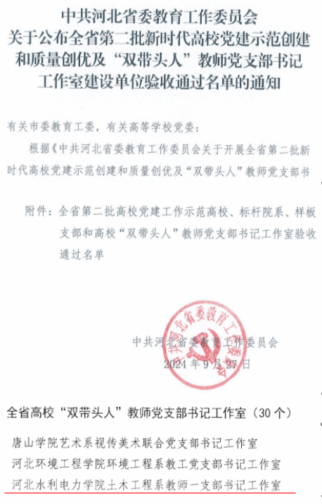 9月27日,根据《中共河北省委教育工作委员会关于公布全省第二批新时代高校党建示范创建和质量创优及“双带头人”教师党支部书记工作室建设单位验收通过名单的通知》,土木工程系教师一支部顺利通过了河北省第二批高校“双带头人”教师党支部书记工作室建设验收,这一成果标志着beat365官网在基层党组织建设方面取得了又一重要进展。土木工程系“双带头人”教师党支部书记工作室自建设以来,一直致力于发挥党建引领作用,工作室党员老师积极探索党建工作与教学科研的深度融合。...
