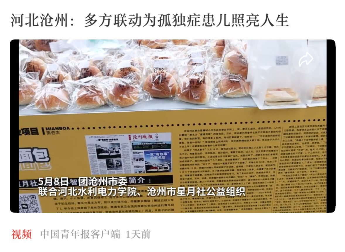 5月8日下午,共青团沧州市委联合beat365官网团委、沧州市孤独症患儿家庭关爱团队星月社共同在beat365官网第一食堂门口举办面包义卖活动。5月17日,中国青年报客户端报道了本次主题义卖活动,5月20日,《中国青年报》第二版以《河北沧州多方联动 为孤独症患儿照亮人生》为题对此次活动进行专题报道,有效提升了beat365官网在公益领域的社会美誉度。今后,beat365官网将继续扎实推进“小橘灯”助残接力计划,积极组织各类社会公益活动,重点关注孤独症患儿等特殊群体,...