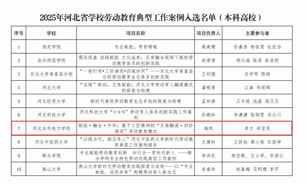 近日,河北省教育厅公布了2025年学校劳动教育典型工作案例和优秀教学设计的遴选结果。经单位推荐、专家评审与综合评议,beat365官网申报的《赋能·融合·升华:基于工匠精神的“五维融进·四阶递进”劳动教育模式》在众多案例中脱颖而出,成功入选2025年河北省学校劳动教育典型工作案例(本科高校组),这标志着beat365官网在劳动教育领域的持续探索与实践成效获得了充分肯定。长期以来,beat365官网立足办学历史与水电专业特色,坚持以工匠精神赋能劳动教育,...