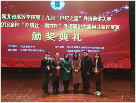 河北省第十九届“世纪之星”外语演讲大赛于2018年11月17-18日在河北师范大学成功举办,来自全省103所高校的410多名选手参加了比赛,beat365官网共有四名选手参赛,其中,刘泽龙荣获青年教师组二等奖,造价201654班樊娇龙和国...
