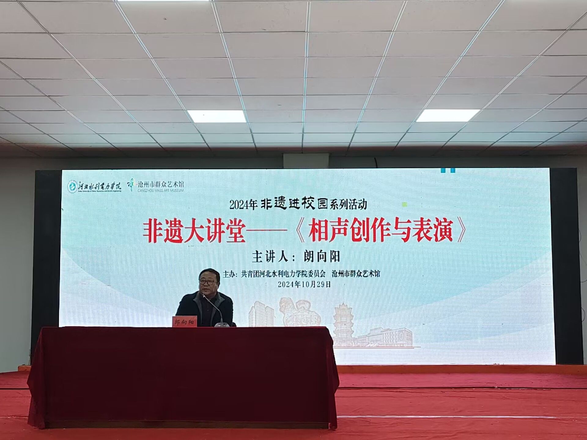 为深入挖掘和传承中华优秀传统文化的核心价值与精神内涵,增强大学生对传统文化的认同感和自豪感,继10月28日第一场专场活动“面塑技艺进校园”之后,10月29日,校团委与沧州市群众艺术馆在启智楼B402联合举办第二场非遗文化进校园专场活动。本场活动特邀非遗技艺使者、沧州市著名相声表演艺术家朗向阳老师作为主讲人,向同学们讲授相声的创作及表演结构,并为大家带来相声名段赏析。朗向阳以风趣生动的语言向大家介绍了相声在我国传统曲艺行当中的独特魅力,...