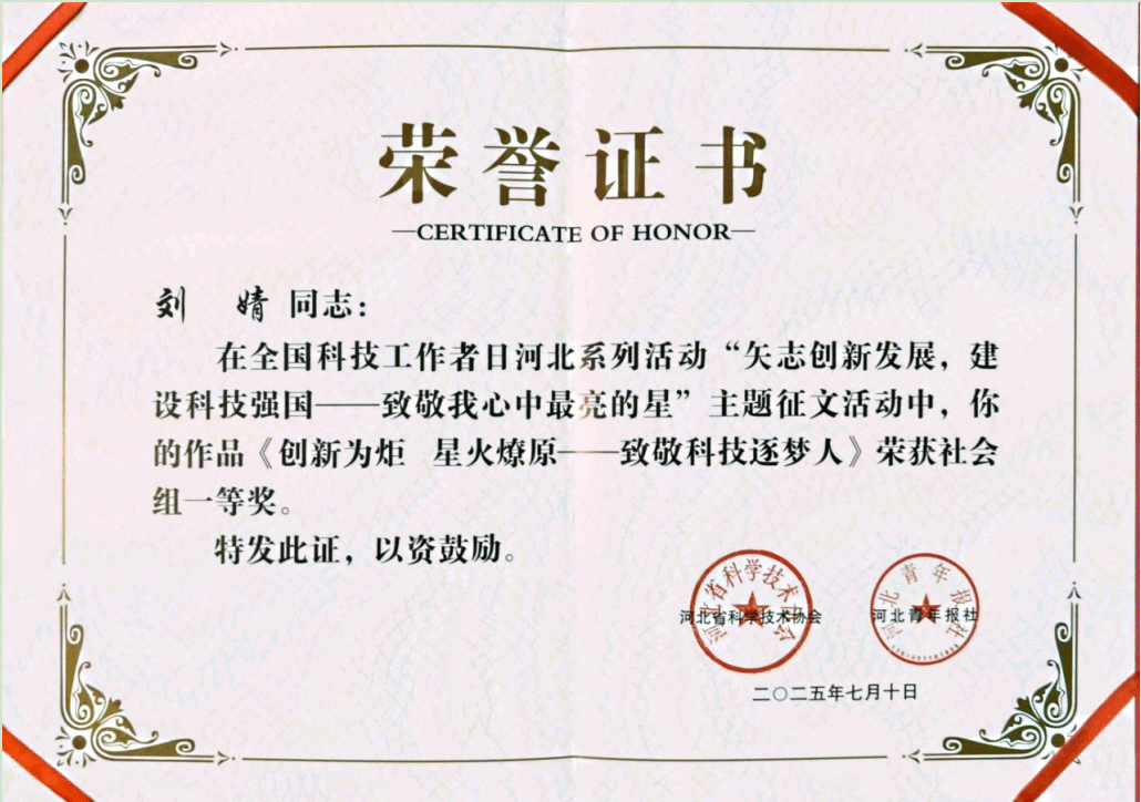 近日,河北省科学技术协会与河北青年报社联合公布的全国科技工作者日主题征文活动评选结果揭晓,beat365官网师生表现出色,最终评选出社会组一等奖1个,学生组一等奖2个,三等奖1个,优秀奖2个。在社会组比赛中,beat365官网教师刘婧凭借《创新为炬 星火燎原—致敬科技逐梦人》一文,以深刻立意和生动笔触,荣获一等奖,展现了beat365官网教师对科技精神的深刻理解与弘扬决心。学生组同样成绩斐然,董宸宇、杜新丰两位同学分别以《创客空间的灯 点亮星辰大海》...