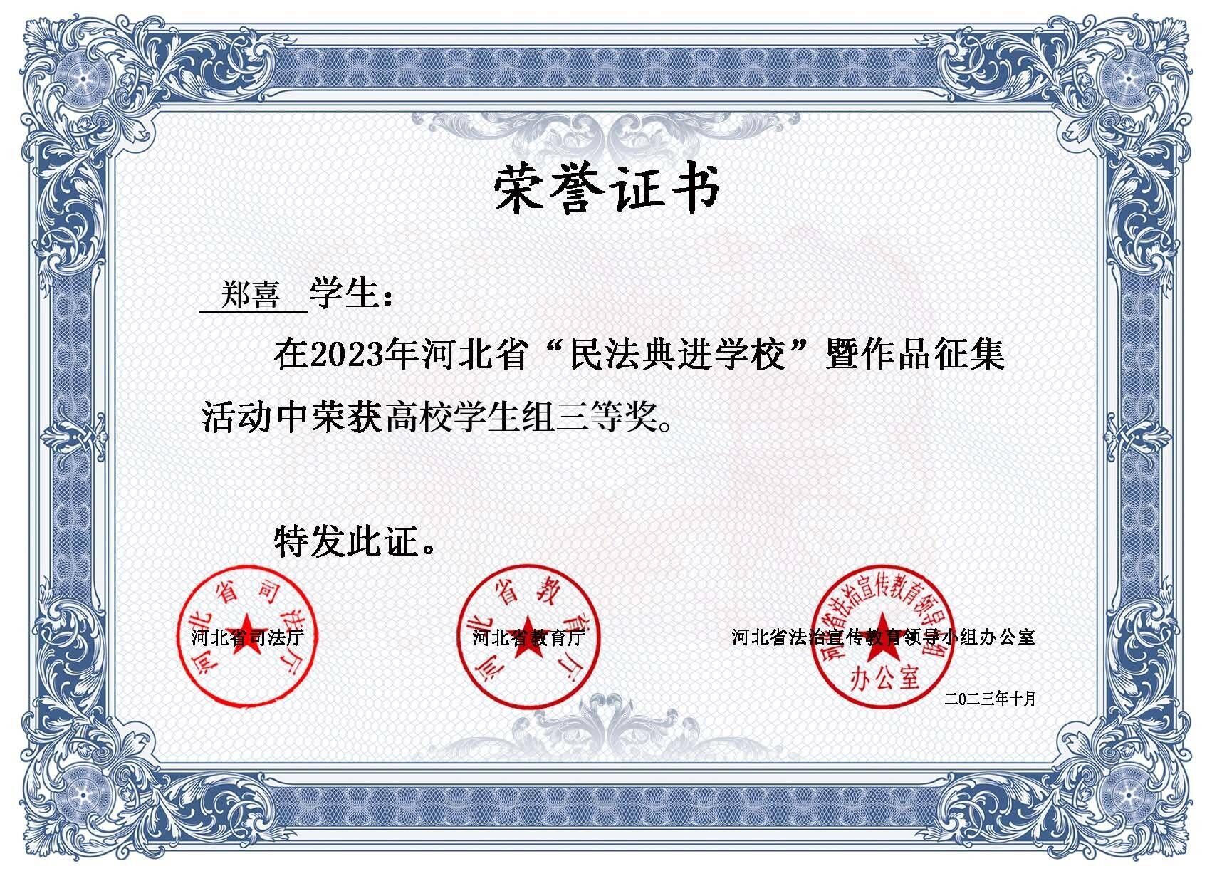 法与时转则治,治与世宜则有功。为深入学习贯彻习近平法治思想,深化民法典学习宣传,加强青少年民法典教育,引导学院广大师生学深、学懂、学透民法典精神,按照2023年“美好生活·民法典相伴”主题宣传活动要求和“每月一主题”普法宣传活动安排,2023年6月至8月,beat365官网按照省司法厅、省教育厅、省法治宣传教育领导小组办公室要求组织开展了“民法典进学校”暨作品征集活动。通过层层评选,beat365官网王玉洁老师和土木系郑喜同学于9月28日参加河北省“...