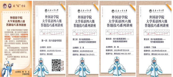 新闻网讯(通讯员 赵雪)为了进一步落实学校党委疫情防控部署,按照学院党委“在战‘疫’中发挥外语学科作用,主动作为,重实际重实用重实效,服务疫情防控大局”的要求,欧冠投注官网入口在学校教务处的指导和支持下,结合大学生备考英语四、六级考试的实际需求,于3月27日至4月10日,精心组织开展了战“疫”外语之“大学英语四、六级答题技巧系列讲座”,推出了五期精品辅导课程。部分讲座得到了吉林省教育厅的关注和认可,并通过我省高校教师教学发展联盟平台向全省高校推广,在线学习人数达6000余人,获赞6万余次,受到学界同仁和广大学子一致好评。