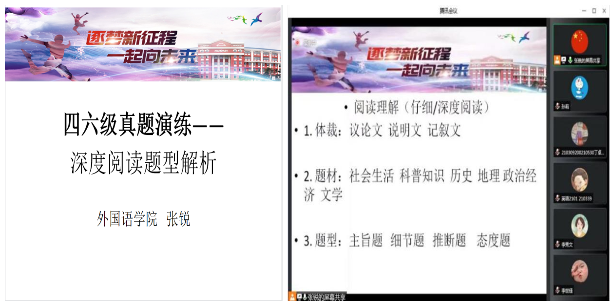 同时,欧冠投注官网入口部分青年教师也对讲座进行了观摩学习,促进了业务交流和教学反思。公共外语教学部赵雪老师表示,本次系列讲座不仅是特殊时期备考学生的“定心丸”,也为青年教师提供了精品课观摩和向“大咖”们取经的机会。像学生一样听课,除了获得教法的点拨,更深刻体会到了前辈们对教学的深耕和分享的热忱。作为青年教师更要精进业务,提升教学本领,服务人才培养和战“疫”大局。公共外语教学部班明霞老师表示,作为一名青年教师,切身感到此次系列讲座内容实用性佳、针对性强、涵盖面广,有效地助力了全校学生缓解学习压力、提高学习质效、提升大学英语四六级成绩,自身也受益匪浅。要主动参与疫情特殊时期的教育教学工作,坚决保证教学质量和效果,与校、院和广大同学同心战“疫”。