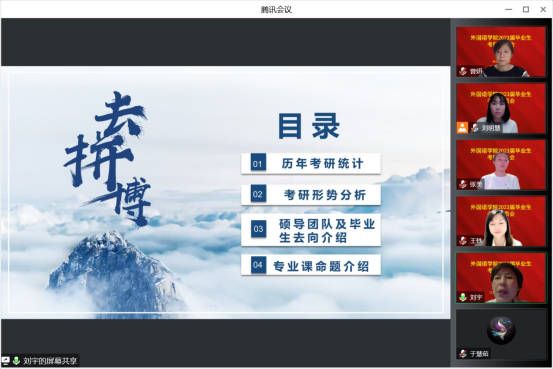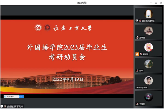新闻网讯(通讯员 魏瑶)为帮助欧冠投注官网入口学子确立考研目标,增强考研信心,解答同学们在考研方面的困惑,欧冠官网于9月19日晚上19:00,在腾讯会议平台召开“2023届毕业生考研动员会”。欧冠投注官网入口院长王轶、副院长曾妍、英语系主任刘宇、俄语系主任张美及全体2023届毕业生参加会议。会议由2023届毕业班辅导员刘明慧主持。