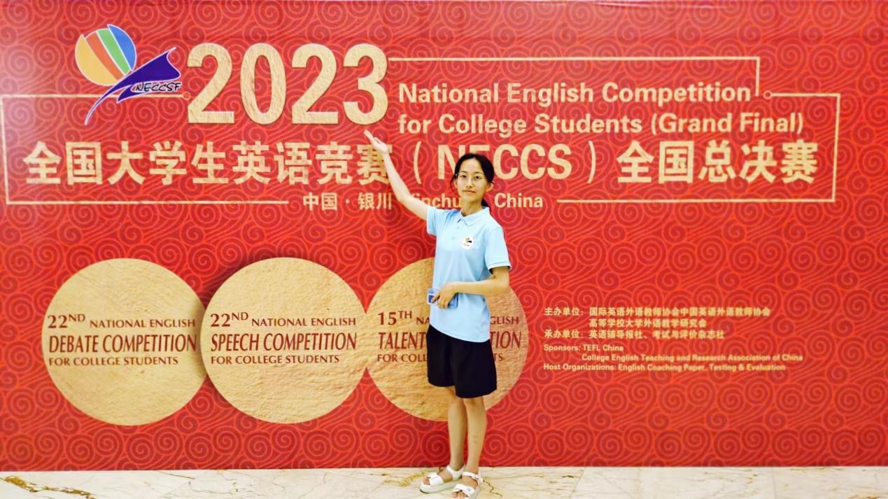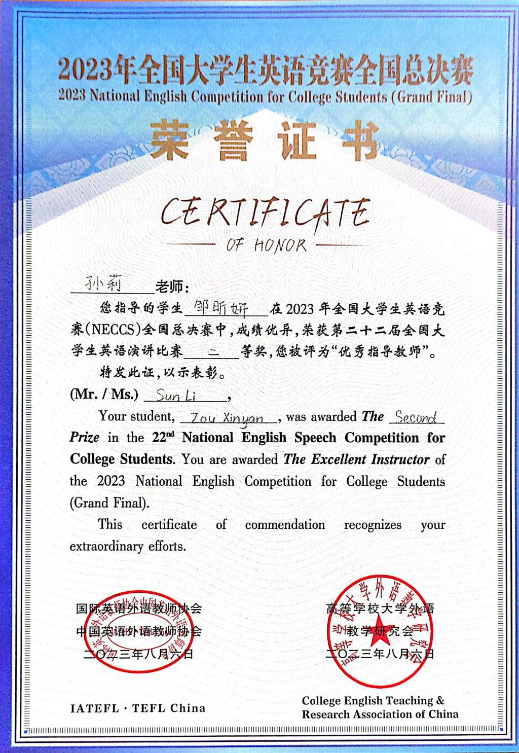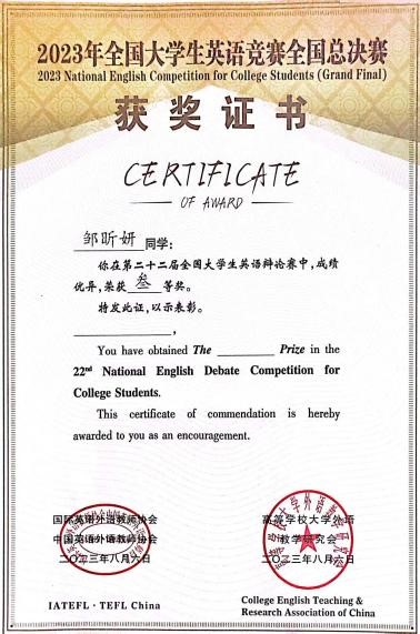 (通讯员 孙莉)8月2日至8月6日,2023年全国大学生英语竞赛(NECCS)全国总决赛在宁夏银川举办,由欧冠官网公共外语教学部教师指导的计算机科学与工程学院信息安全专业邹昕妍同学作为吉林省复赛一等奖选手代表参赛。在总决赛中,邹昕妍同学准备充分,沉着冷静,以优秀的临场发挥荣获第二十二届全国大学生英语演讲比赛二等奖、第二十二届全国大学生英语辩论赛三等奖两项荣誉,并在主持人选拔中脱颖而出,参与了英语学习经验交流会的主持工作,被评为“优秀主持人”,基于以上优秀表现,邹昕妍同学被评为“优秀参赛选手”。 同时,我校欧冠投注官网入口教师孙莉作为邹昕妍的指导教师在本次全国大学生英语竞赛中,荣获演讲比赛“优秀指导教师”、英语辩论赛“优秀指导教师”两项荣誉。