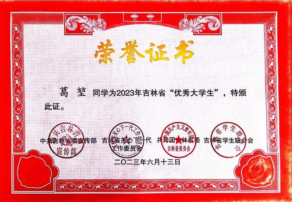(通讯员 张晓君)近日,由中共吉林省委宣传部、共青团吉林省委员会、吉林省关心下一代工作委员会、吉林省学生联合会共同开展的2023年吉林省“优秀大学生”寻访活动结果揭晓。欧冠官网葛堃同学在2023年吉林省“优秀大学生”寻访活动中获得“优秀大学生”荣誉称号。