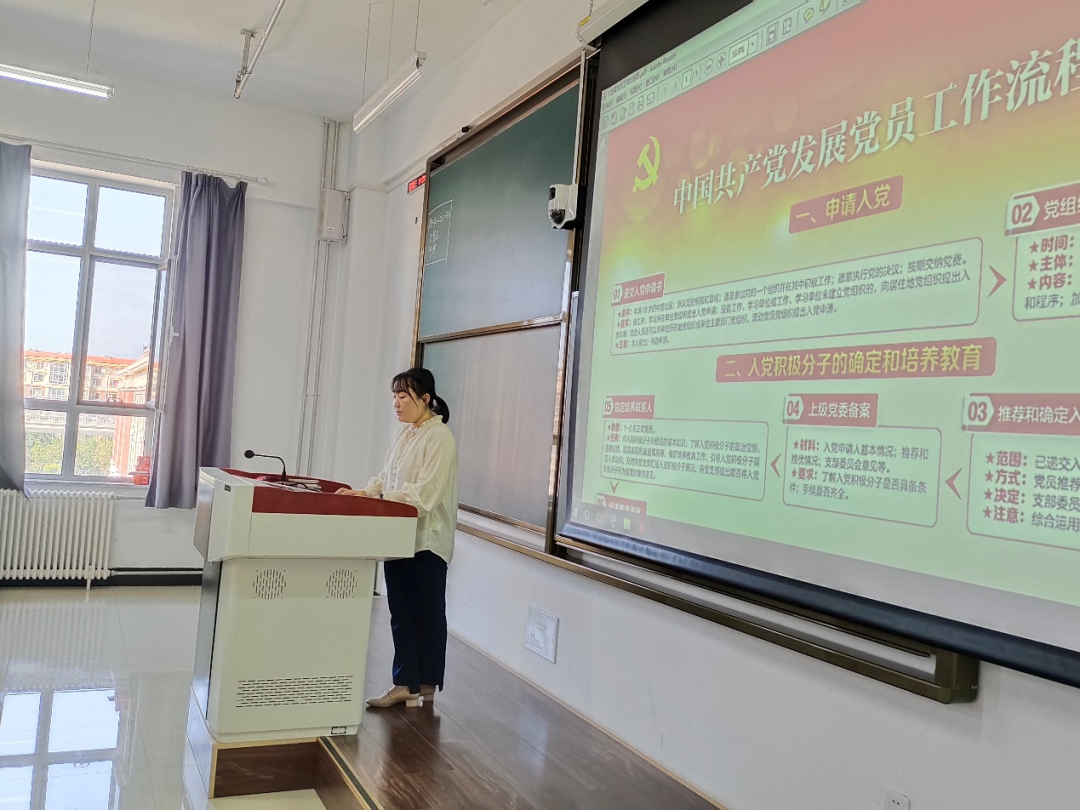 刘老师从递交入党申请书开始,成为积极发展、发展对象等入党流程一一详细讲解。当代青年大学生的政治方向关系着整个民族的发展前景,中国青年始终是中华民族实现伟大复兴的先锋力量,希望青年学生牢记初心、担当使命,在学习实践中磨砺能力和本领,践行“请党放心,强国有我”的誓言。
