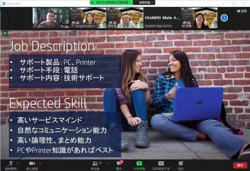 新闻网讯(通讯员 李梓溪)为培养更加符合市场需求的日语专业人才,推进欧冠官网日语专业学生的实习与就业,欧冠投注官网入口于7月6日,特邀惠普大连分公司日本部经理孙佳奇、日本质量管理部文化指导老师林明春,通过ZOOM平台为欧冠官网日语专业学生举行了专场线上实习宣讲会。欧冠投注官网入口日语系宋卓时老师主持会议,日语专业本科生及研究生全员参加。