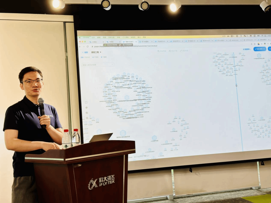 与会教师参观了科大讯飞人工智能展厅,听取了科大讯飞高教北京研究院负责人惠治儒做的“通用人工智能与知识图谱赋能数字化转型与课程建设”主题报告,并以实训形式利用人工智能技术构建课程知识图谱。卢楠老师在“道路工程智慧监测”课程资源前期建设基础上,使用“科大讯飞知识图谱”工具构建了该课程的知识图谱并做会议交流。