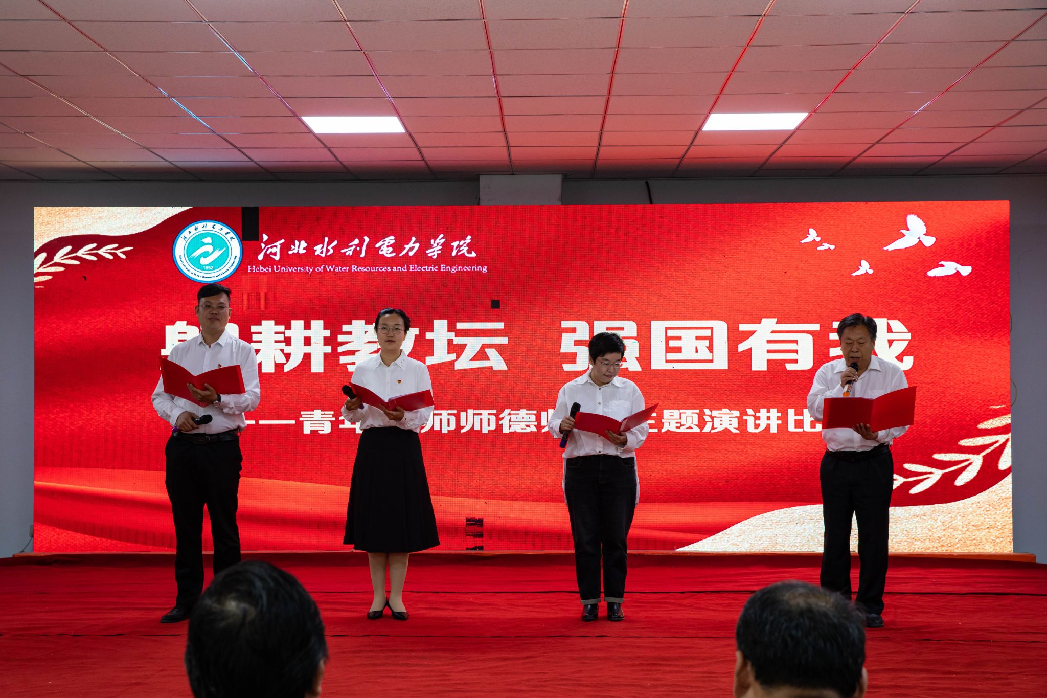 在演讲结束评分过程中,交通工程系田国锋、基础教学部李晓琳、校团委张烨、水利工程系卢伯阳四位老师为大家激情澎湃的朗诵了《开拓者》,60后、70后、80后、90后教师同频共振、共抒情怀,体现了一代代水院人秉承“勤奋、求是、创新、笃行”校训踔厉奋发、薪火相传、甘为人梯、无私奉献的开拓精神。