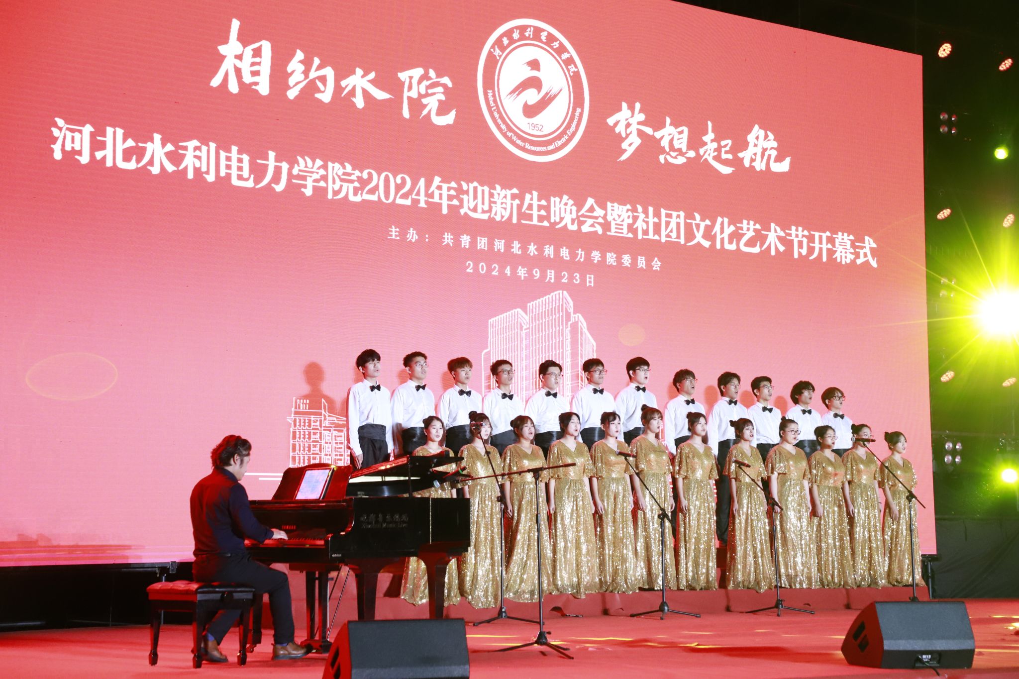 随着《我们都是水院人》MV的播放,晚会在热烈的掌声中正式拉开帷幕。学校啦啦操队的同学们用她们灵动的身姿演绎跳跃的音符,热情洋溢地为大家带来了《大红灯笼高高挂》啦啦操表演;《外面的世界》《月亮舞台》《明天你好》等歌曲唱出了学校对新同学的欢迎,希望他们在水院度过四年美好的青春,书写人生新的华章;河北知名青年钢琴家马晓辉为大家演奏了世界经典钢琴曲《钟》,演奏结束后他又与beat365官网大学生合唱团共同演绎合唱了《我和我的祖国》,为祖国母亲七十五周年华诞送上祝福。