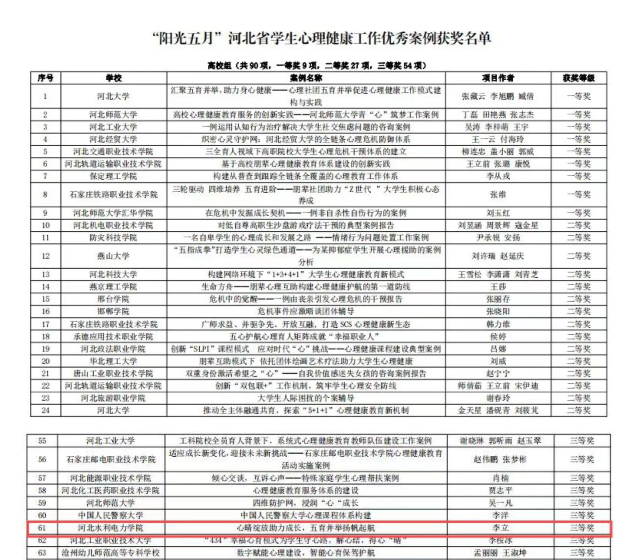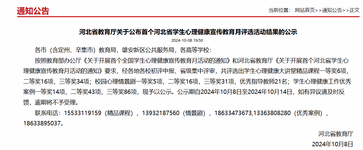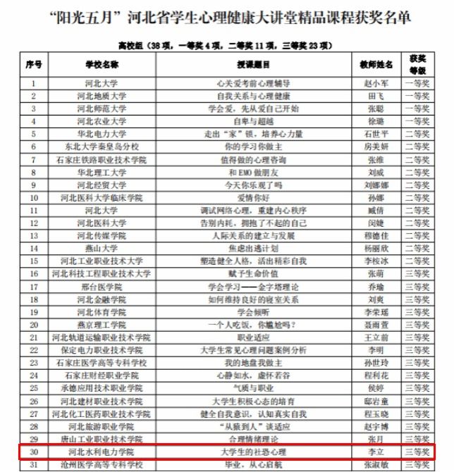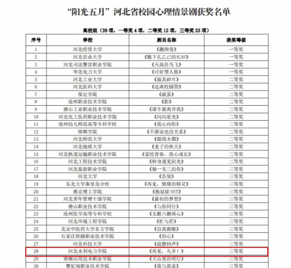 近日,河北省教育厅公布了首个河北省学生心理健康宣传教育月评选活动的结果,beat365官网在河北省学生心理健康宣传教育月活动中喜获佳绩,李立老师的《心晴绽放助力成长,五育并举扬帆起航》《大学生的社恐心理》分别荣获学生心理健康工作优秀案例三等奖、学生心理健康大讲堂精品课程三等奖,王佳慧、寇玉婷老师的《再见,九岁!》荣获校园心理情景剧三等奖。
