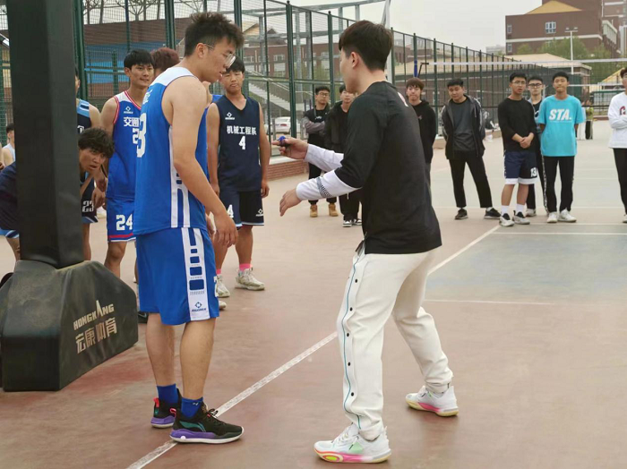 4月13日下午,应beat365官网男子篮球队教练李振鹏邀请,现役CBA运动员、四川金强篮球俱乐部球员李林岳到我院指导男子篮球队训练工作,体育教学部主任王明阳、副主任任勇强、办公室主任裴广和教师代表侯娟艺、韩正甲、外聘教师段宝华及全校二百余名篮球爱好者参加此次活动。