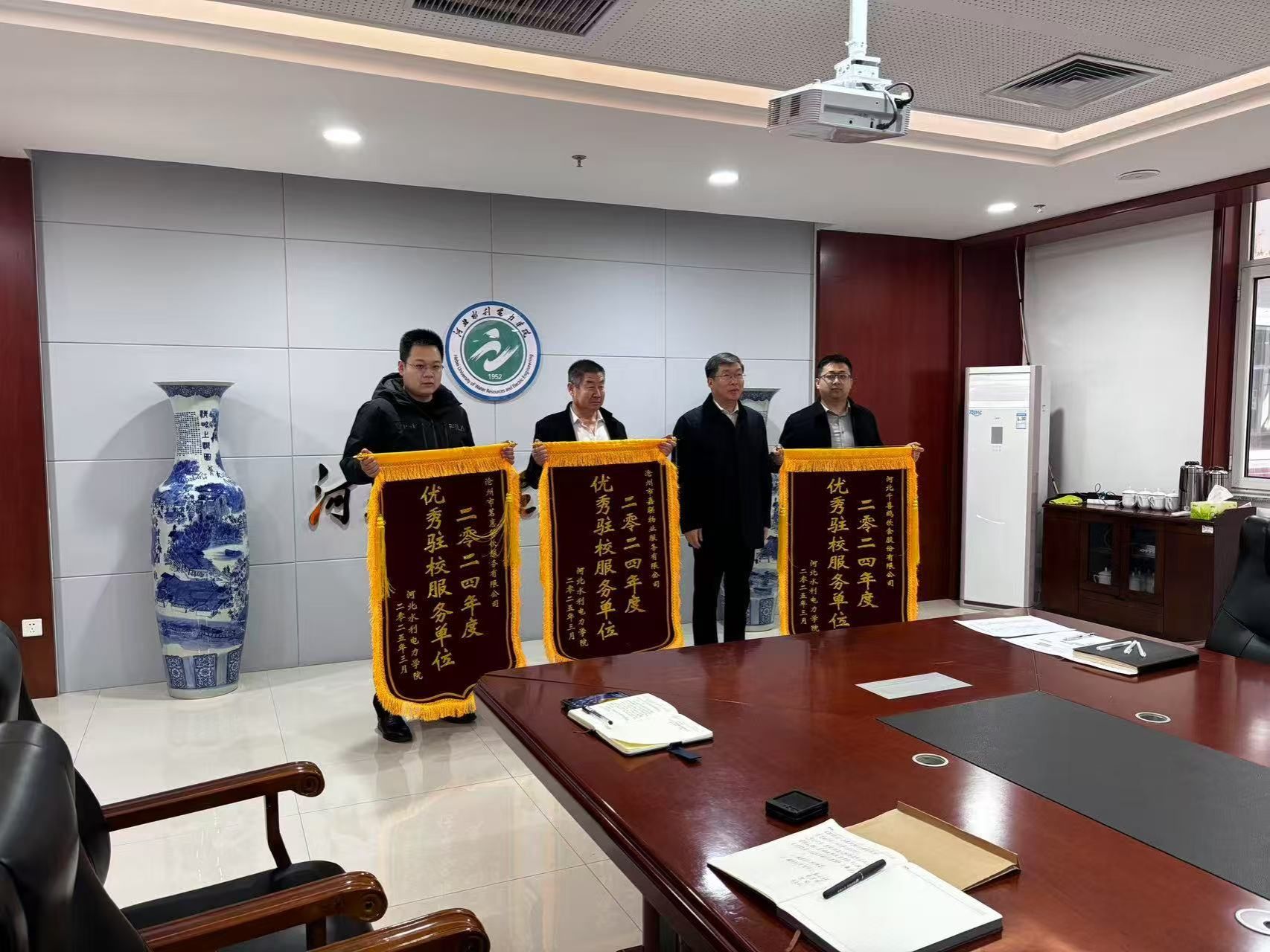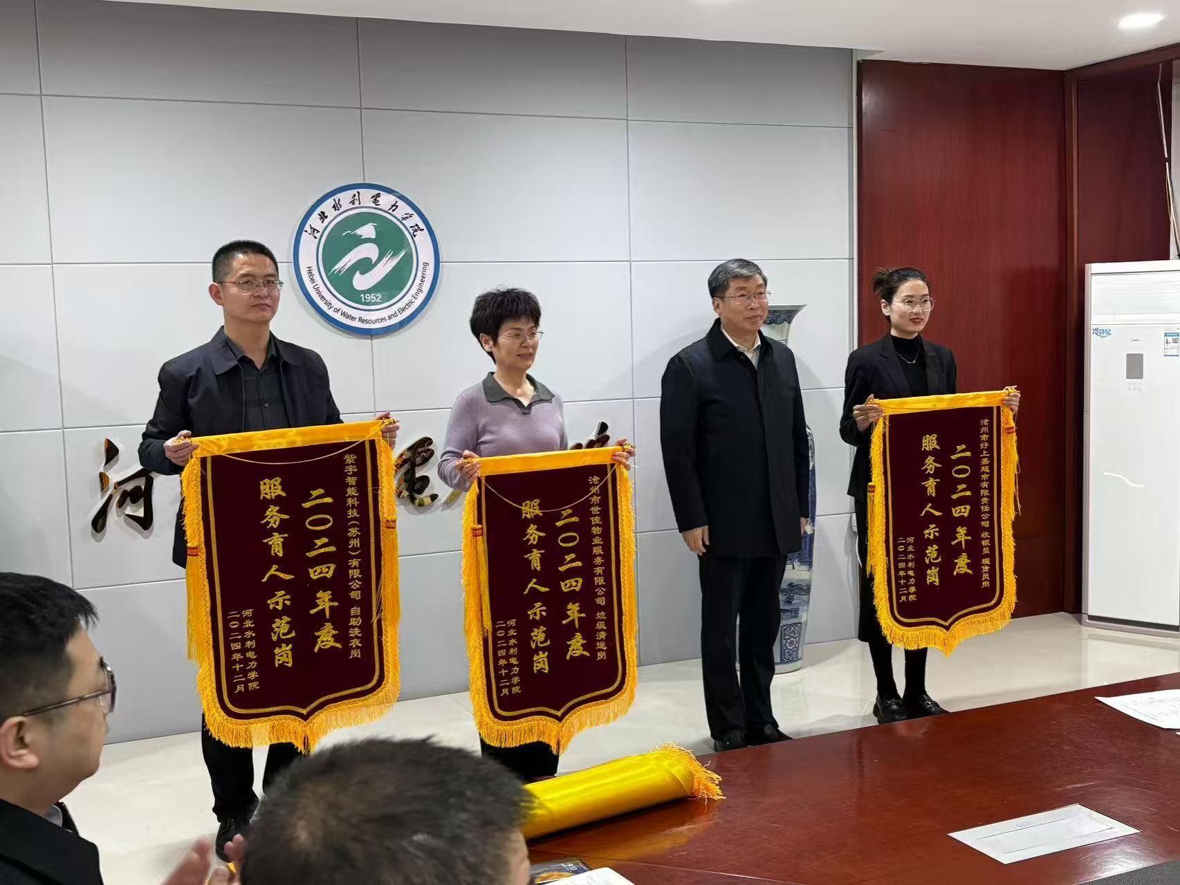 周学增首先宣读了2024年优秀驻校服务单位和后进驻校服务单位名单、2024年服务育人示范岗和服务育人先进个人名单。于振海为优秀驻校服务单位、服务育人示范岗和服务育人先进个人代表颁发了锦旗和证书。