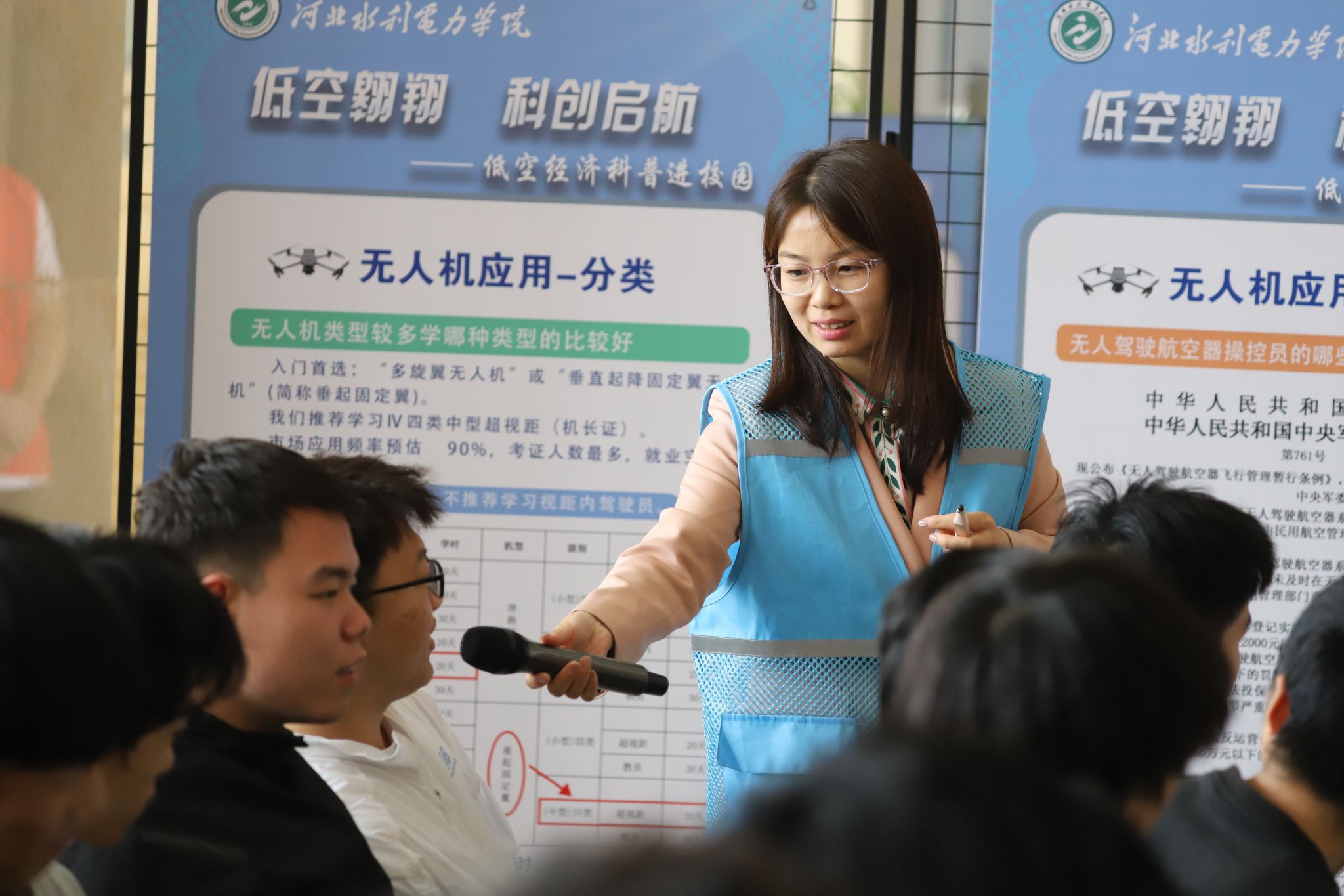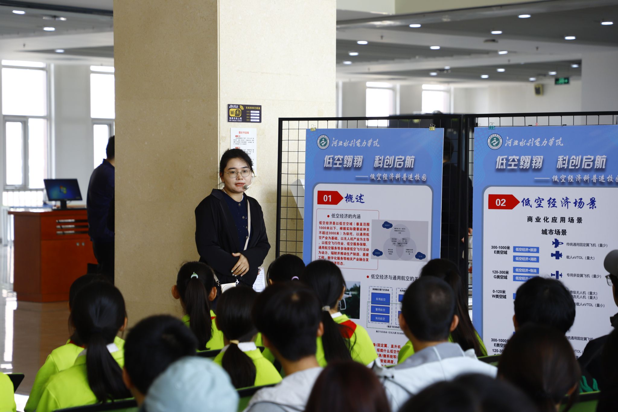 在低空经济应用场景和无人机操作原理展区,交通工程系教师崔梦雅与河北航翔低空经济有限公司舒楠为现场观众带来了一场精彩的科普讲解。她们结合实际案例与政策文件,深入解读了低空经济在农业植保、物流运输、应急救援等领域的应用场景,详细介绍了无人机技术原理及安全规范,并对行业发展趋势进行了全面分析。同时,展区内集中展示了涵盖多领域的最新无人机产品及行业级解决方案,充分展现了科技赋能产业的创新成果。