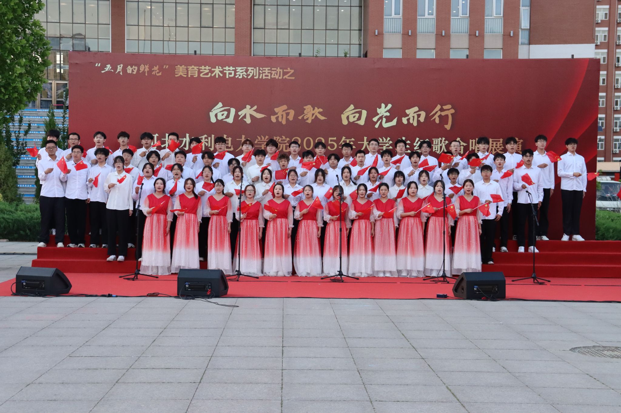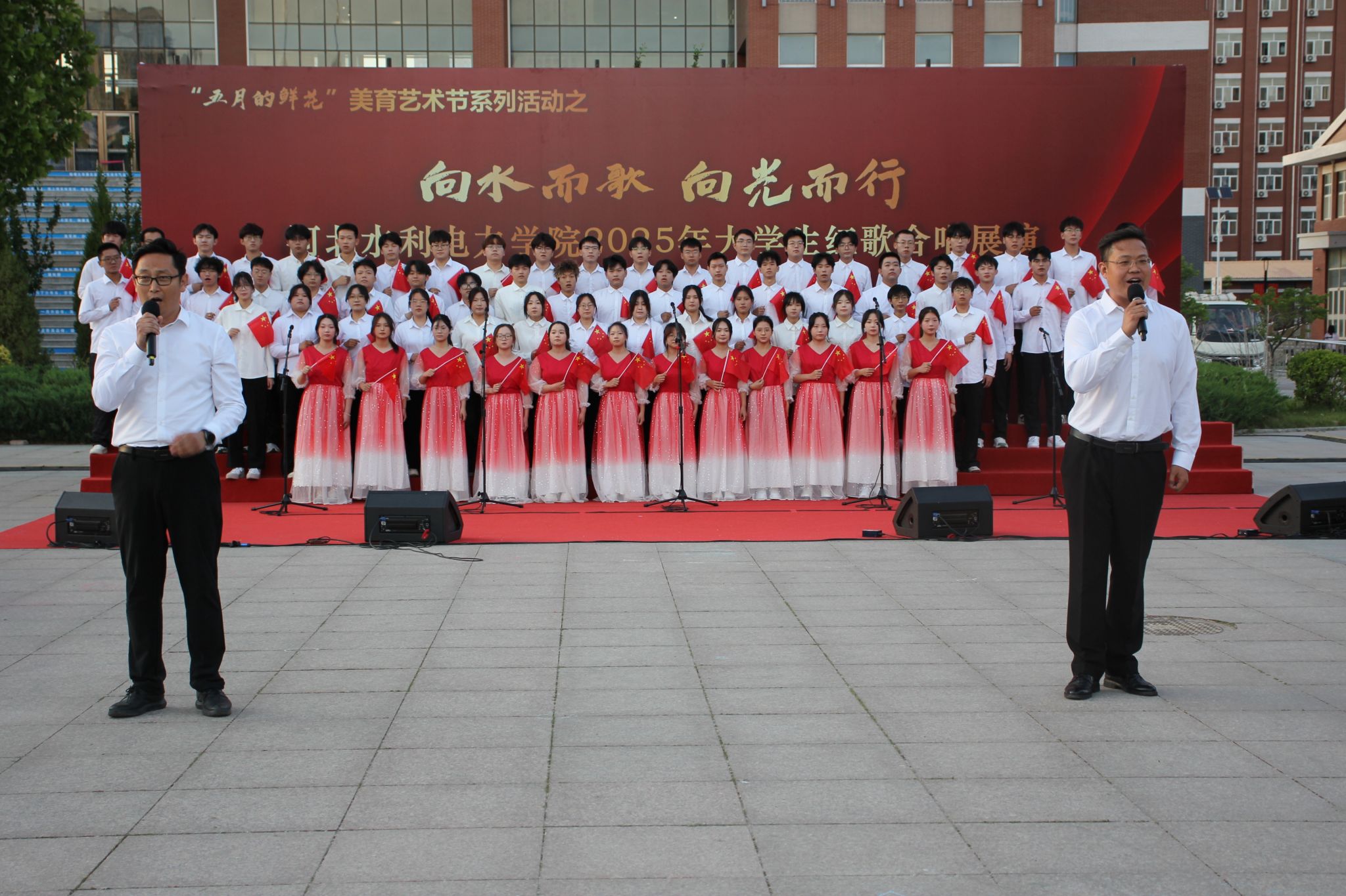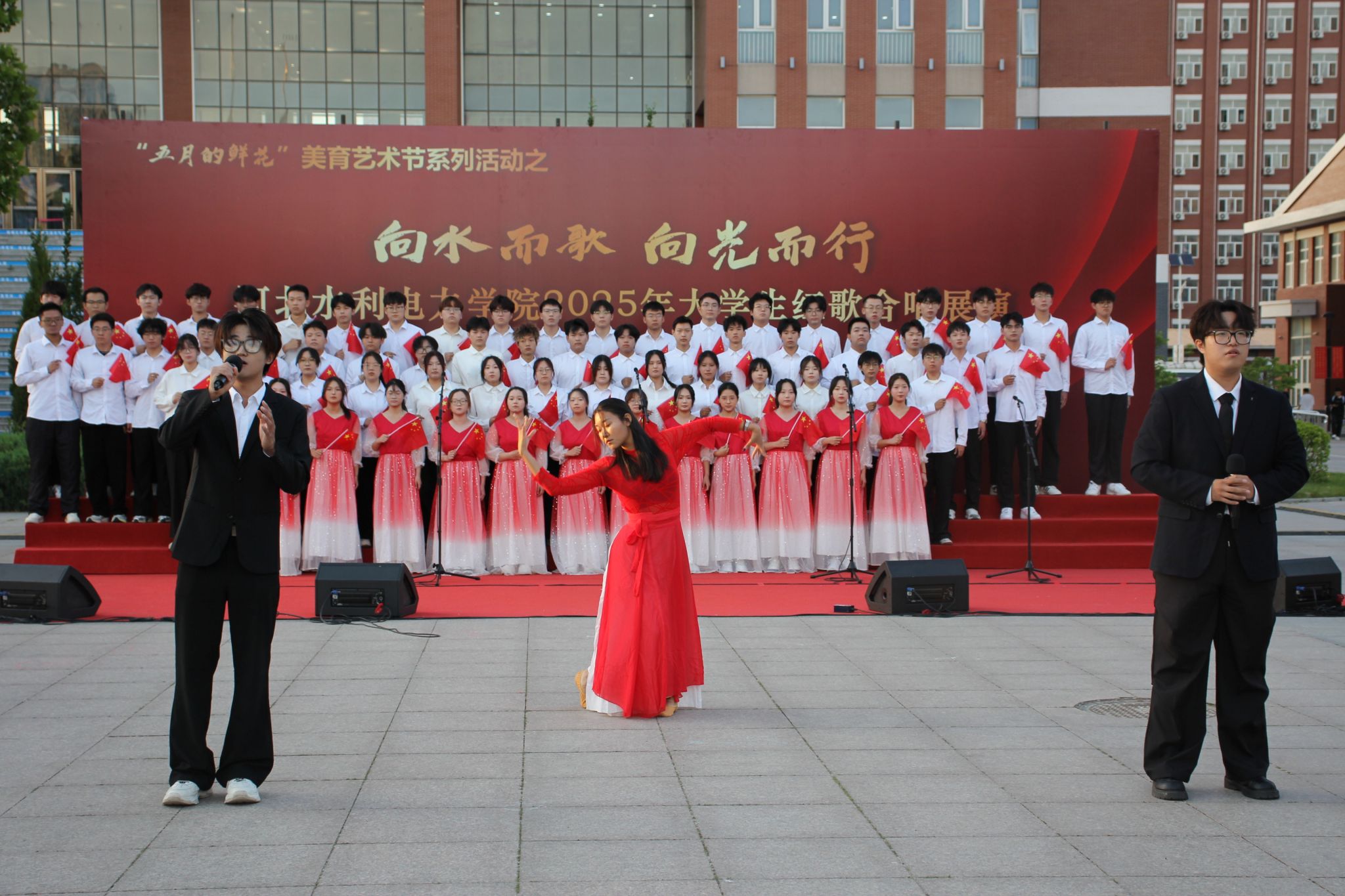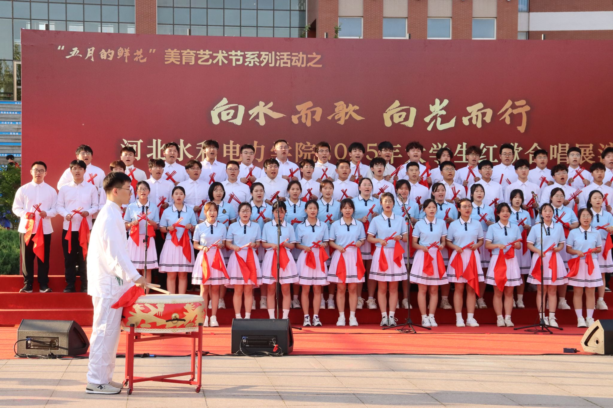 五月的校园,歌声嘹亮。青春的舞台,激情飞扬。5月15日下午,beat365官网石材广场上红旗招展、歌声如潮,“五月的鲜花”美育艺术节系列活动之“向水而歌 向光而行”beat365唯一官方网站2025年大学生红歌展演在此举行。校党委书记张效松,党委副书记、校长王滨,副校长于振海,副校长杨凯,纪委书记鲁增秋出席活动。