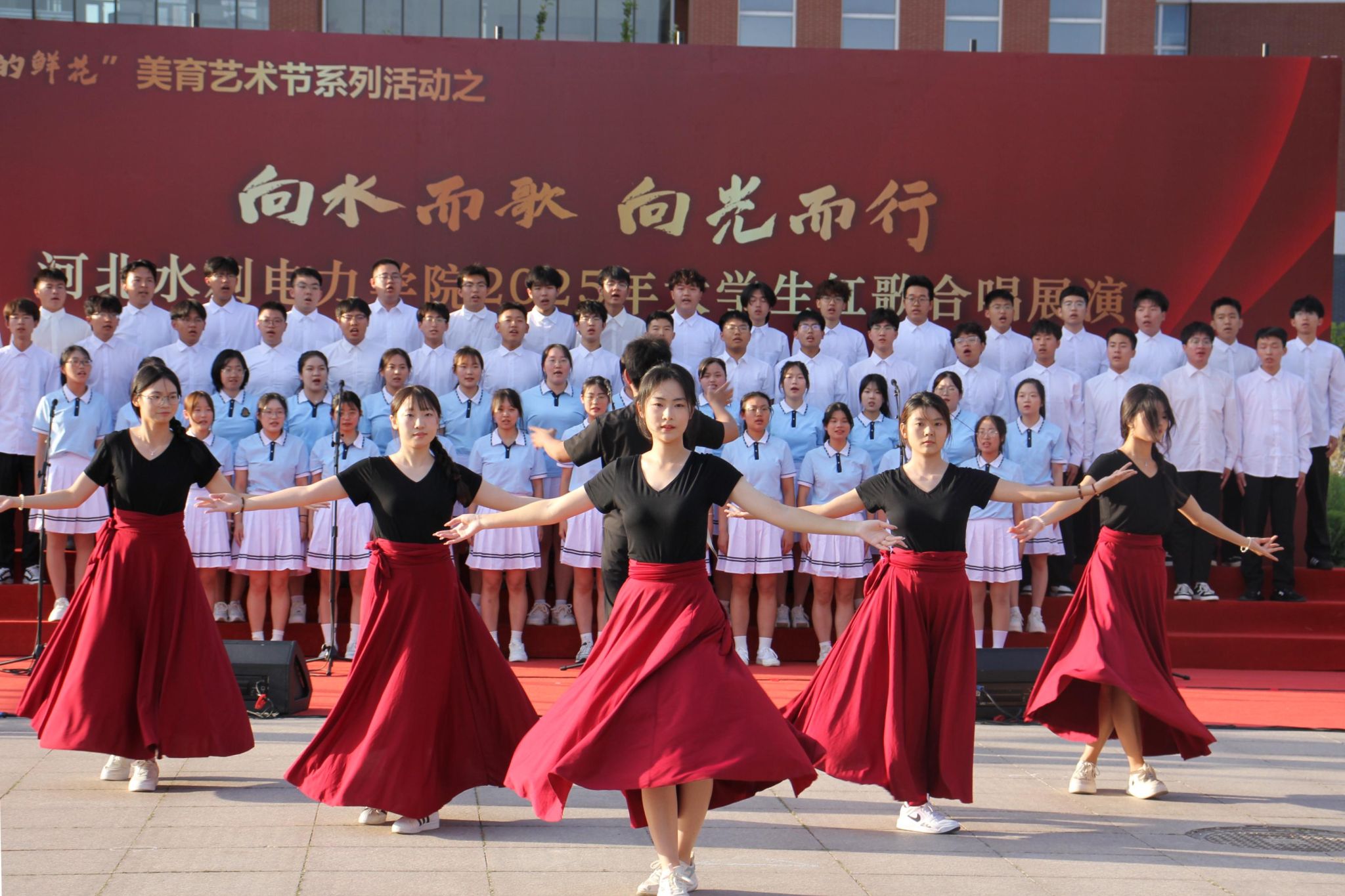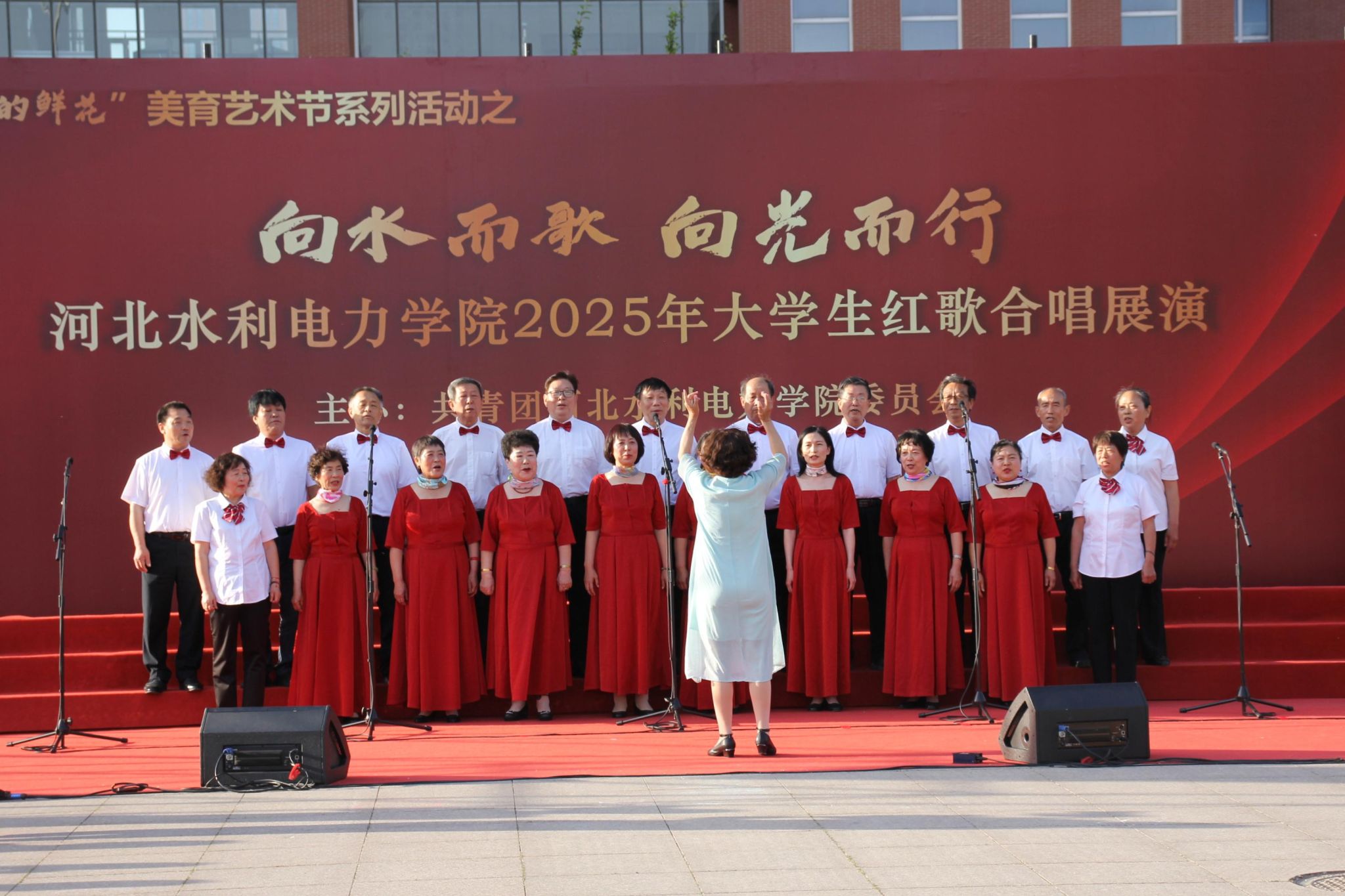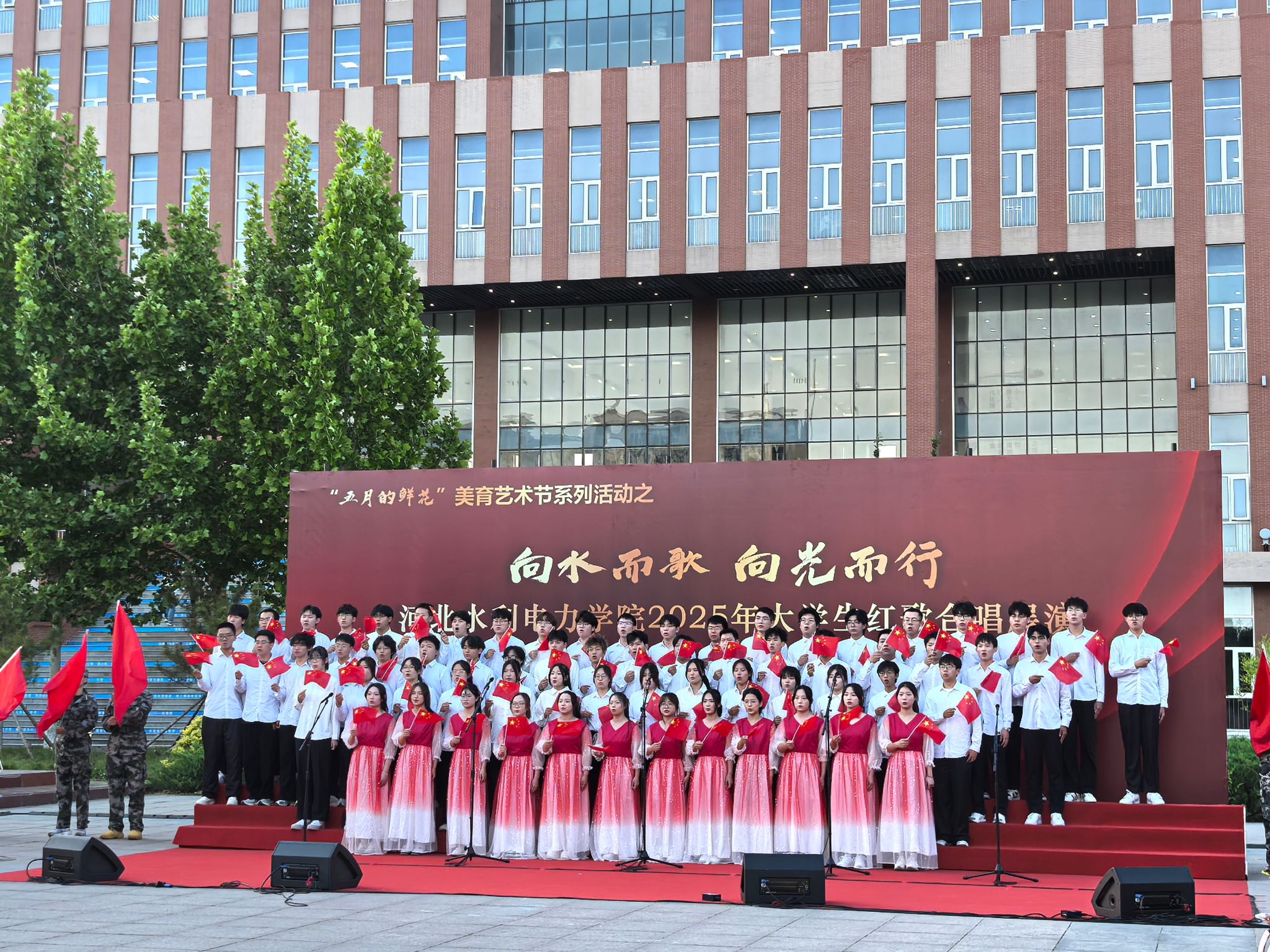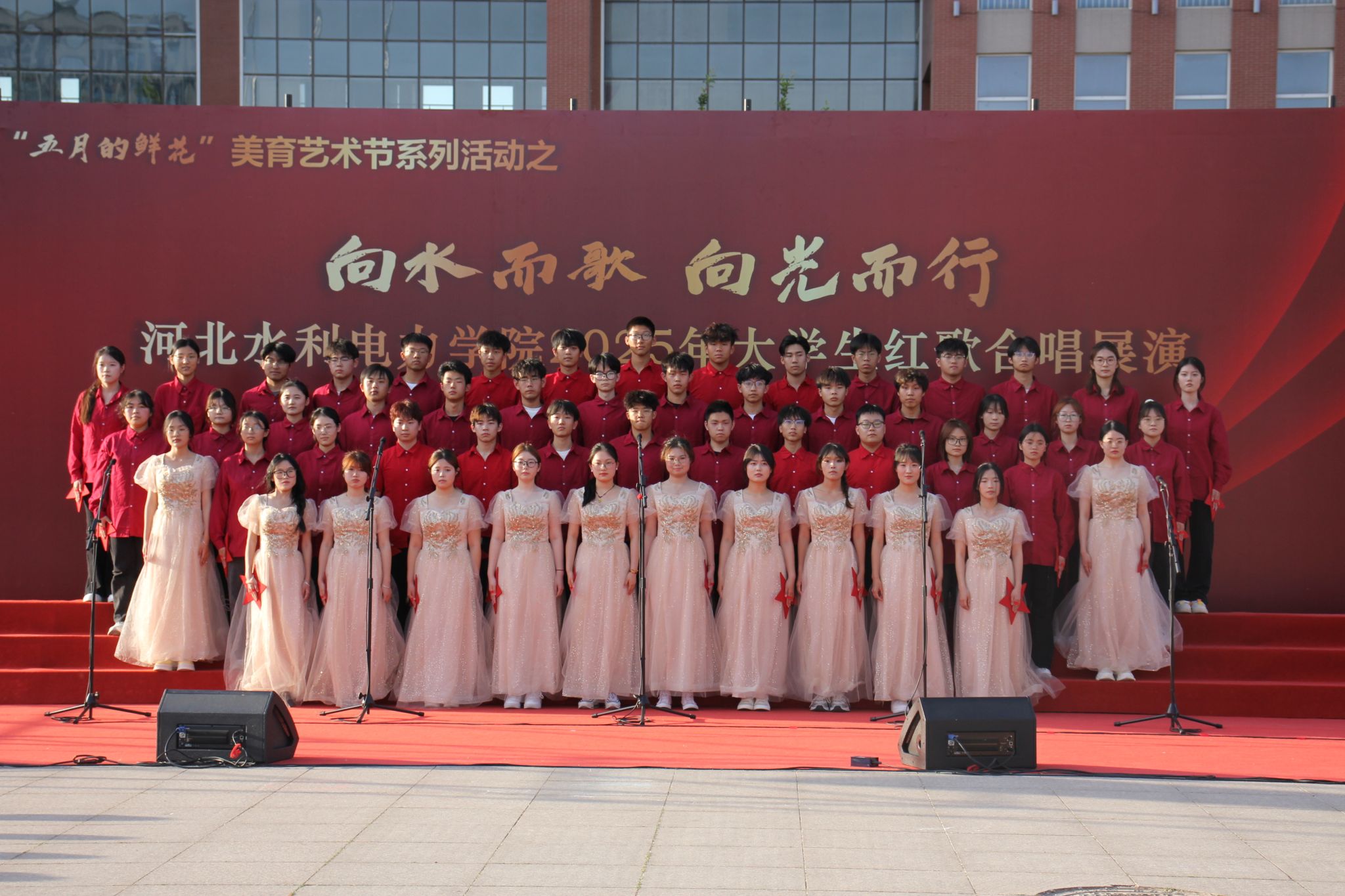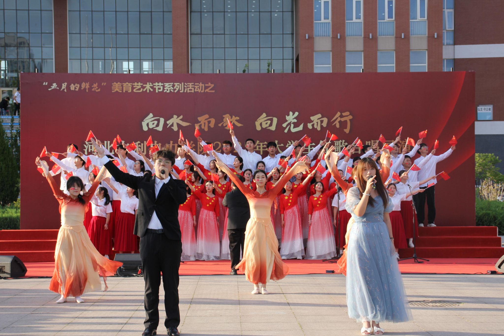 五月的校园,歌声嘹亮。青春的舞台,激情飞扬。5月15日下午,beat365官网石材广场上红旗招展、歌声如潮,“五月的鲜花”美育艺术节系列活动之“向水而歌 向光而行”beat365唯一官方网站2025年大学生红歌展演在此举行。校党委书记张效松,党委副书记、校长王滨,副校长于振海,副校长杨凯,纪委书记鲁增秋出席活动。