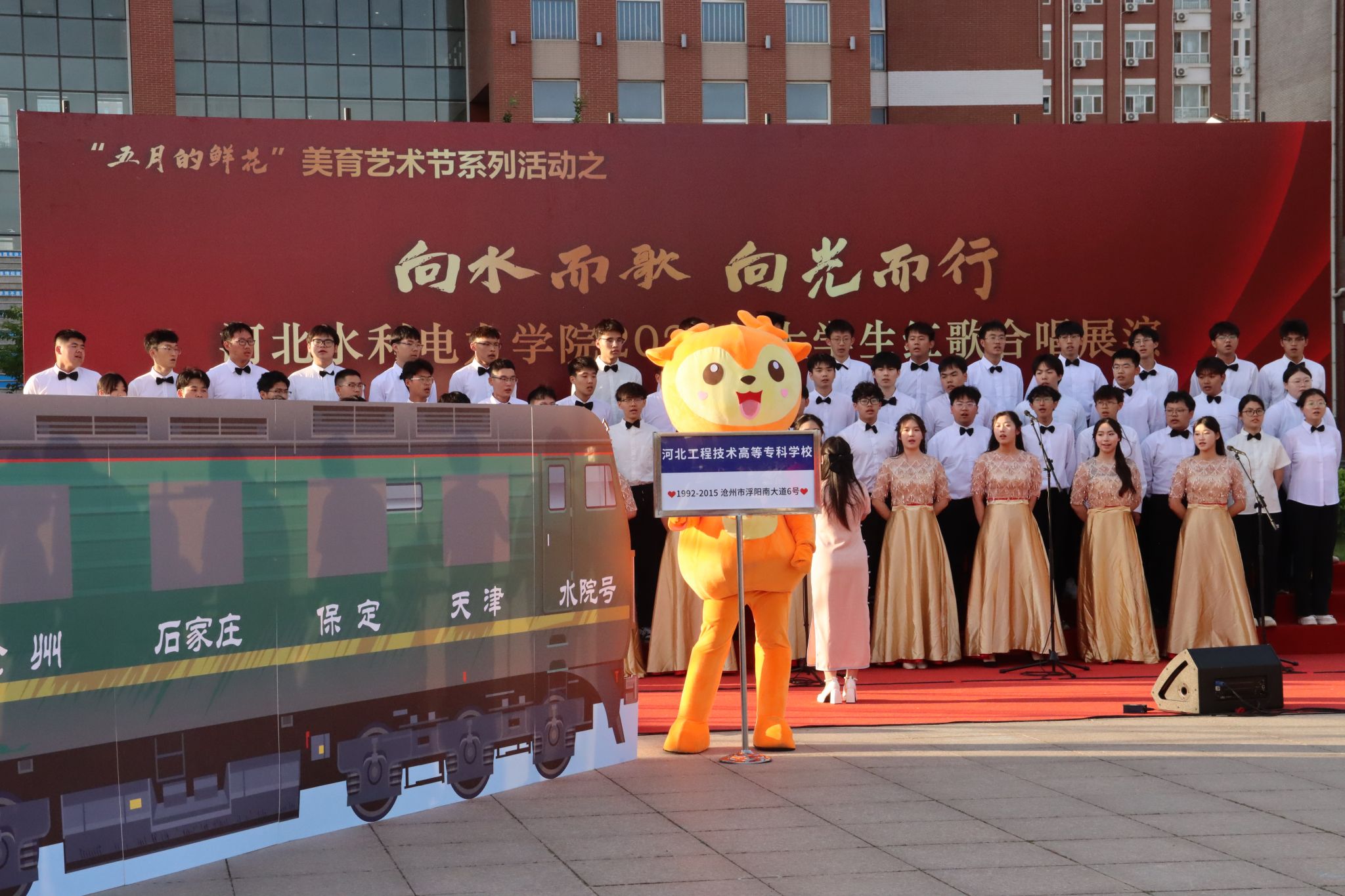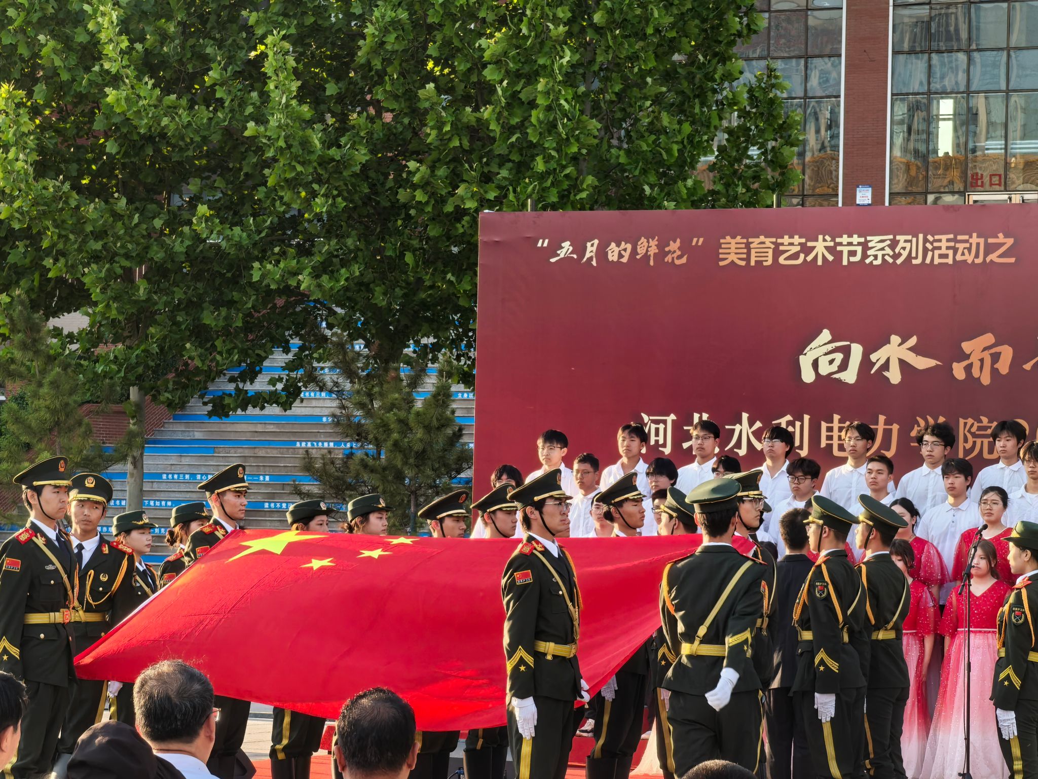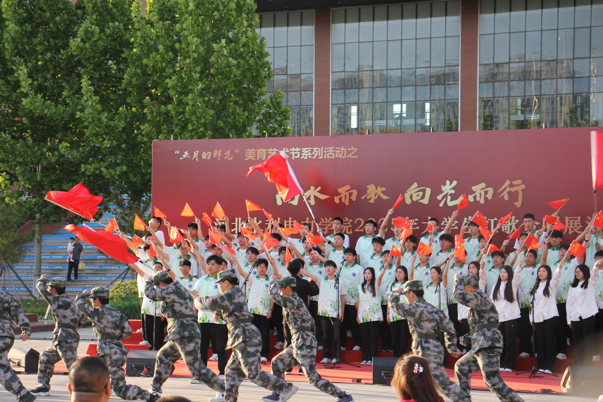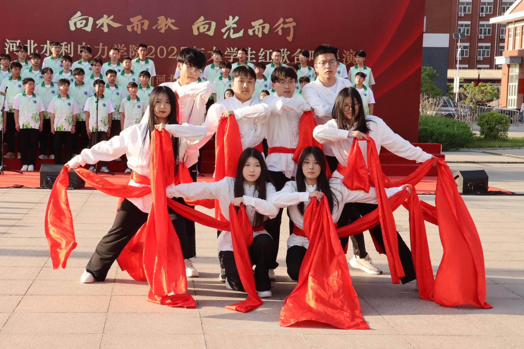 五月的校园,歌声嘹亮。青春的舞台,激情飞扬。5月15日下午,beat365官网石材广场上红旗招展、歌声如潮,“五月的鲜花”美育艺术节系列活动之“向水而歌 向光而行”beat365唯一官方网站2025年大学生红歌展演在此举行。校党委书记张效松,党委副书记、校长王滨,副校长于振海,副校长杨凯,纪委书记鲁增秋出席活动。