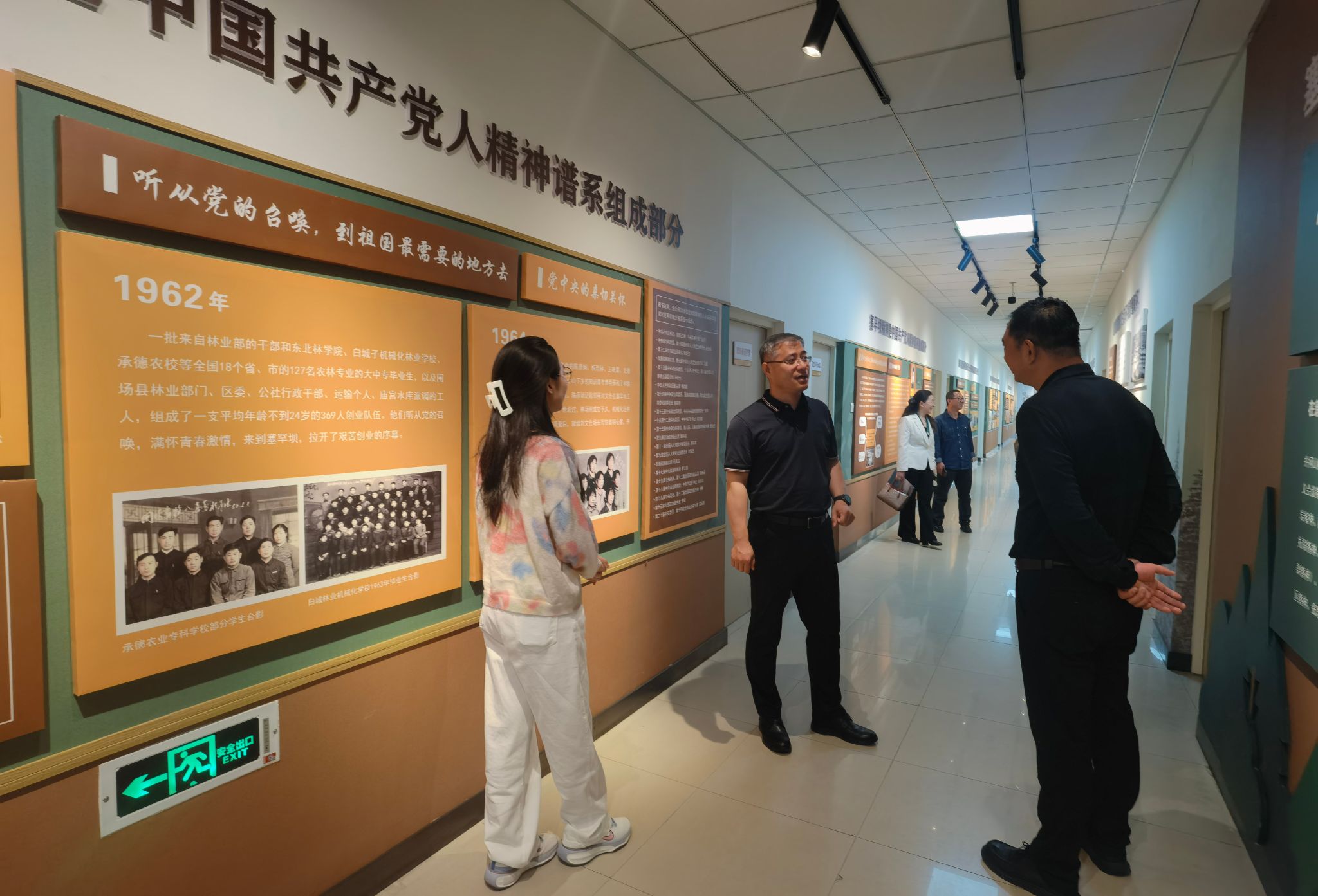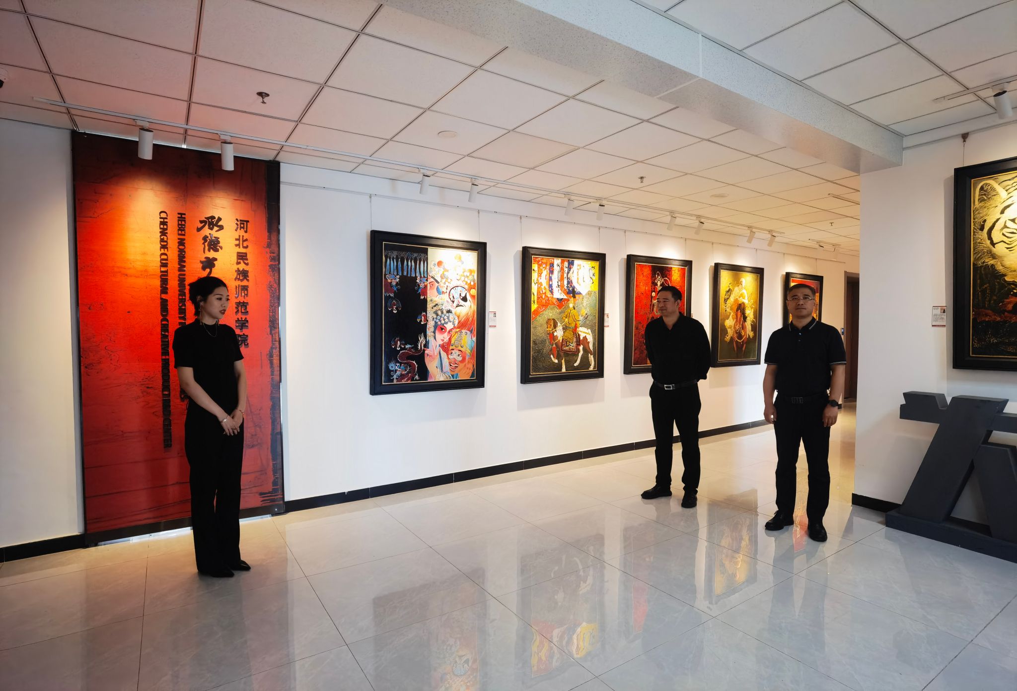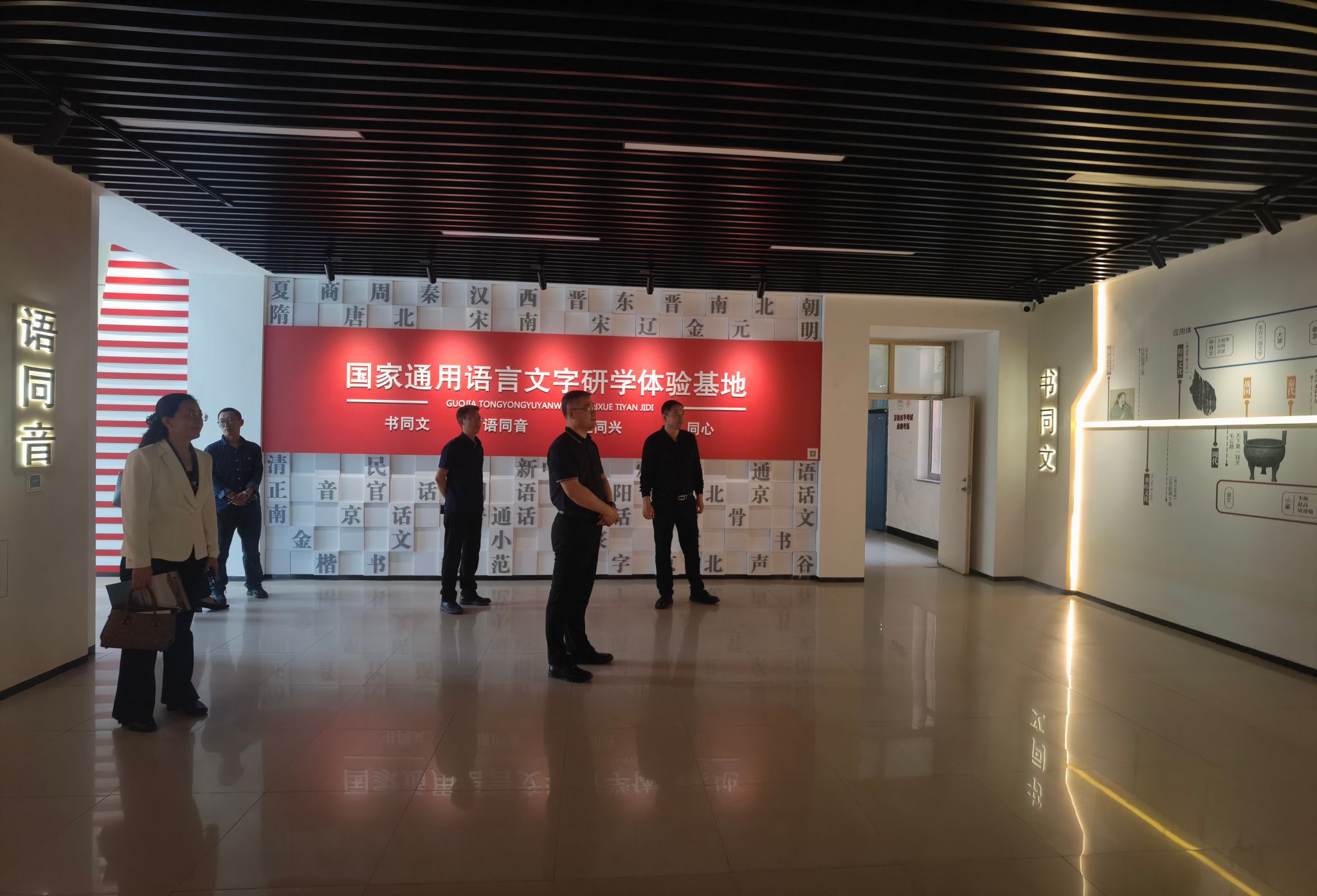 会后,在张佰儒的陪同下,杨凯一行首先参观了马克思主义学院,学院负责人详细讲解了围绕塞罕坝精神打造的“塞罕坝-铸牢中华民族共同体意识的历史象征”文化厅廊。在国家通用语言文字研学体验基地,杨凯一行听取了学院以“书同文、语同音、业同兴、人同心”为主题构建的中国语言文字发展历史介绍,了解了基地对于承德语言、历史、文化研究的丰厚成果以及在教学实践、应用研究、社会服务等方面的功能。在国家级众创空间,王松涛介绍了学院围绕“教育链、人才链、产业链、创新链”构建的“四链耦合”双创教育体系,以漆艺术研究中心为例,他介绍了中心基于产业背景,在实践教学、技法创新、产学研结合、就业创业等方面构建的产学研一体化教学新模式及创新成果。