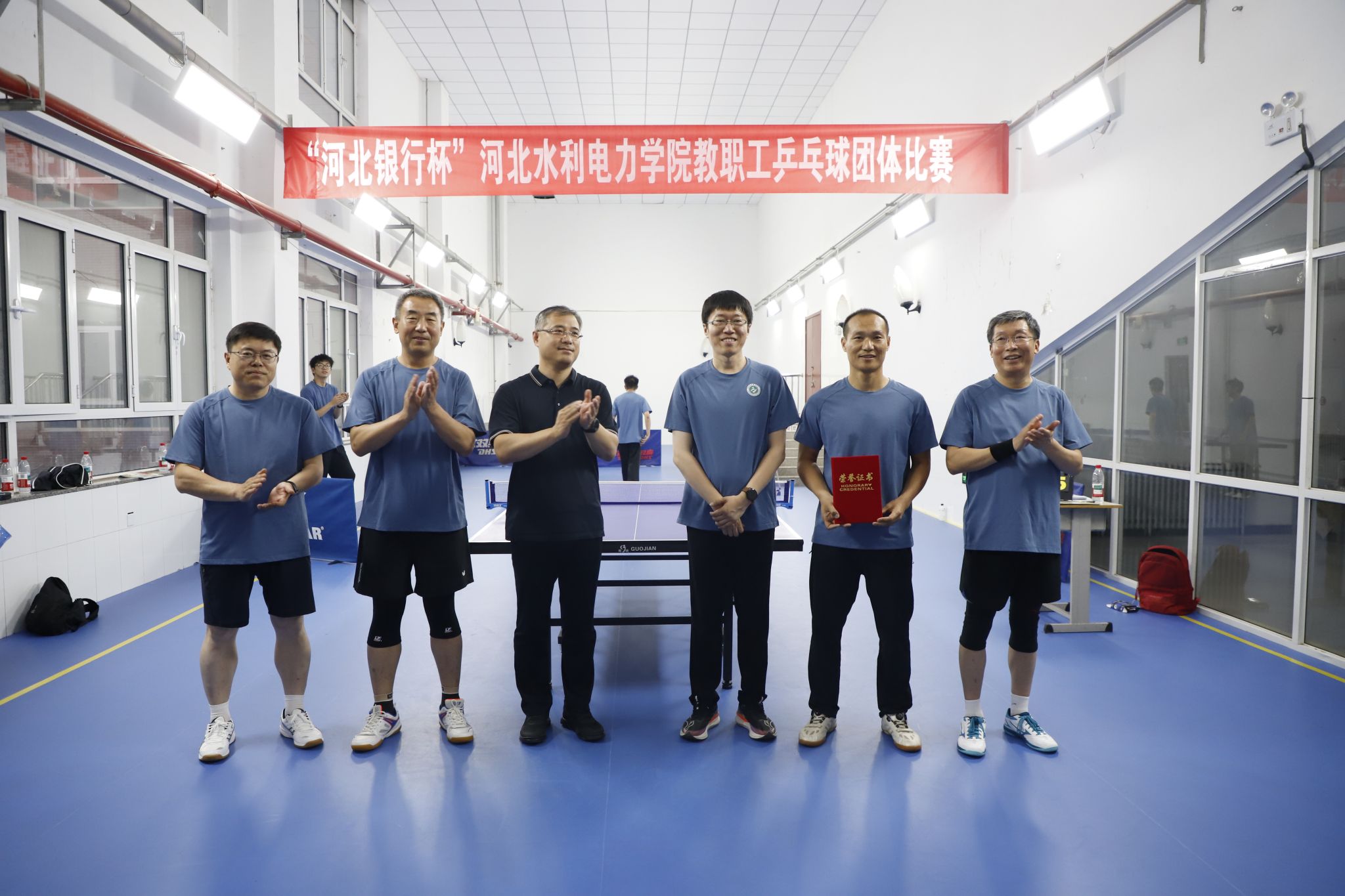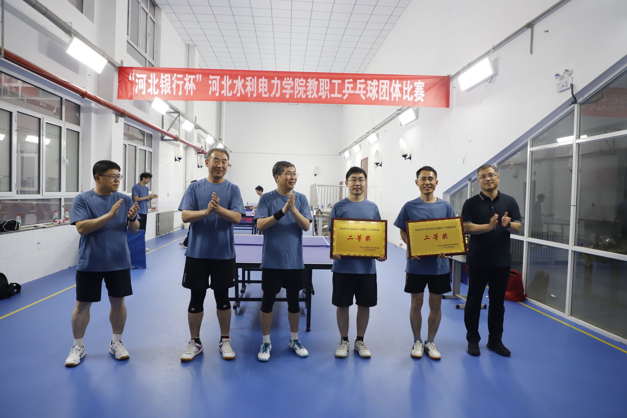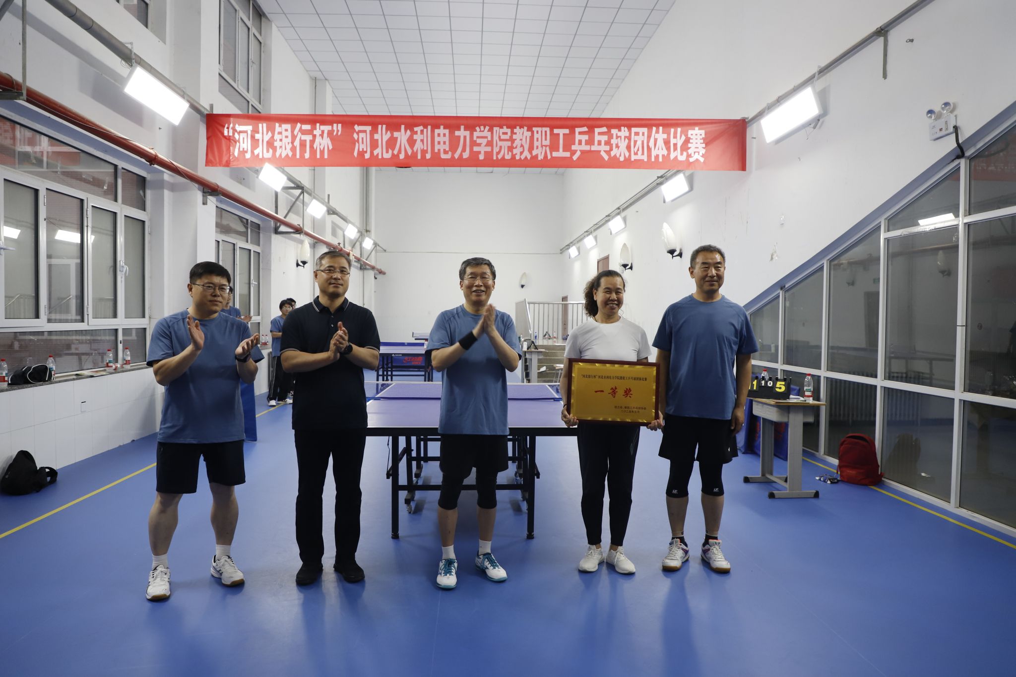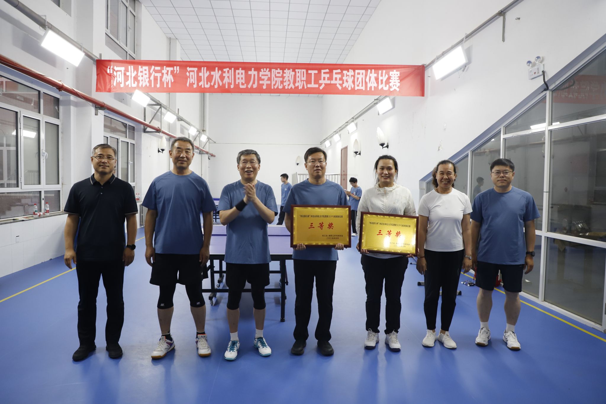 为丰富教职工文体生活,增强团队凝聚力,5月29日,由校工会主办、教职工乒乓球协会承办的“河北银行杯”教职工乒乓球团体比赛在启智楼活动中心火热开赛。校领导张效松、王滨、崔立功、于振海、杨凯、董志良、鲁增秋到场参加,张效松为开幕式致辞,比赛由董志良和鲁增秋开球。