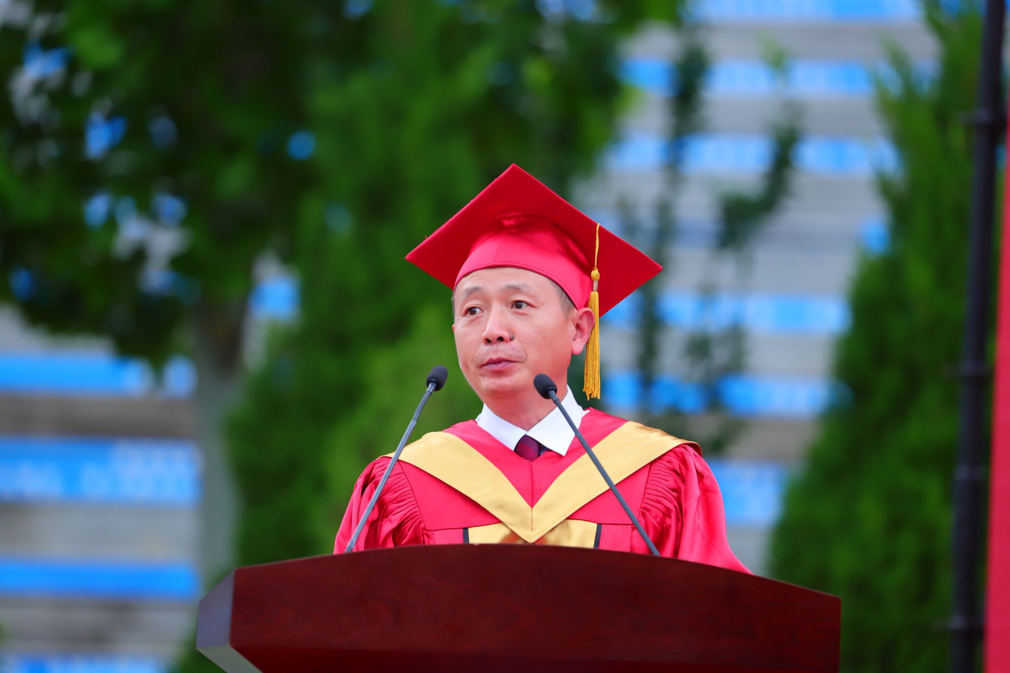 典礼上,党委副书记、校长王滨以《菁菁水院绽芳华 乘势扬帆启新程》为题发表了热情洋溢的讲话。他代表学校向2685名2025届毕业生圆满完成学业表示热烈的祝贺,回顾了毕业生们在校期间的点点滴滴,肯定了大家的努力与进步,并从“一是你我向上,家国向前——希望你们永远胸怀家国,将个人奋斗汇入时代洪流。二是学而不止,行以致远——希望你们永远勤学不怠,在社会大课堂求知探源。三是百舸争流,奋楫者先——希望你们永远砥砺奋斗,在时代最前沿百炼成钢。”等三个方面对毕业生们提出了殷切期望和谆谆教诲,希望毕业生们在变革的时代把握好人生前行的方向,既要仰望星空、志存高远,把爱国之情、报国之志与个人理想抱负紧密结合,在服务国家发展和人民福祉的实践中彰显青春风采、贡献青春力量;也要脚踏实地、行稳致远,保持乐观积极、包容豁达的心态,勇于做困难而真正有价值的事,不过分在意一时之快慢、一事之成败,坚持在运动中保持健康、在阅读中丰盈内心、在交流中拓宽视野,以美好自我创造出更加美好的未来。