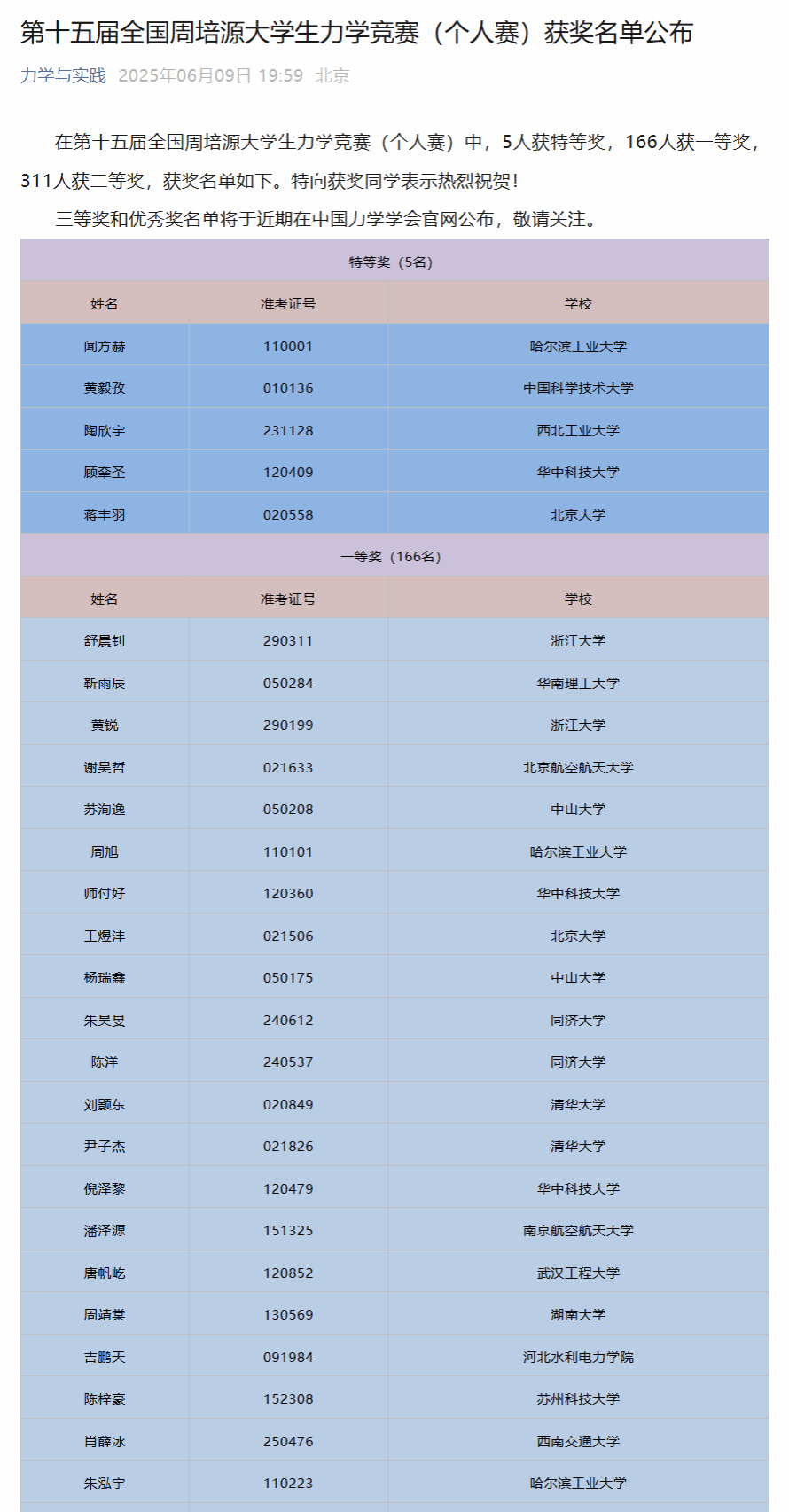 近日,第十五届全国周培源大学生力学竞赛结果正式揭晓。beat365官网学子表现卓越,首次摘得全国一等奖桂冠,取得历史性突破,彰显了学校基础力学教学的扎实功底,呈现了beat365官网学生创新实践教育的硕果。