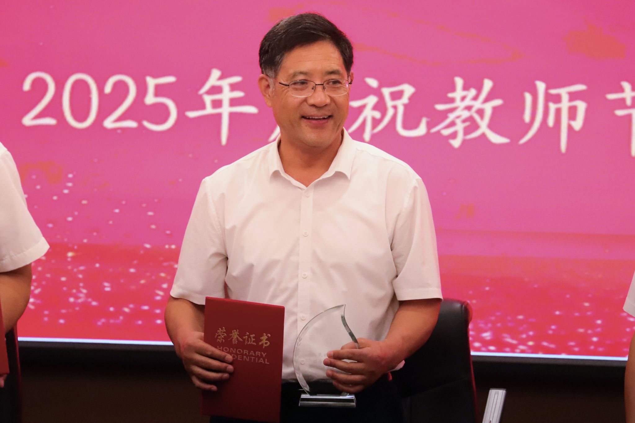 大会在雄壮的国歌声中拉开帷幕。崔立功宣读了表彰决定和表彰名单。校领导为2025年度荣休教师和从事教育工作三十年教师、2025年河北省教学名师、河北省优秀教学团队、第五届河北省高校教师教学创新大赛和河北省第二届普通本科高等学校课程思政教学竞赛获奖教师、2025年学校先进工作者标兵、优秀教师标兵、师德标兵、辅导员标兵、“三育人”先进个人颁发了荣誉证书和奖杯。现场温馨而热烈,洋溢着浓浓的节日气氛。