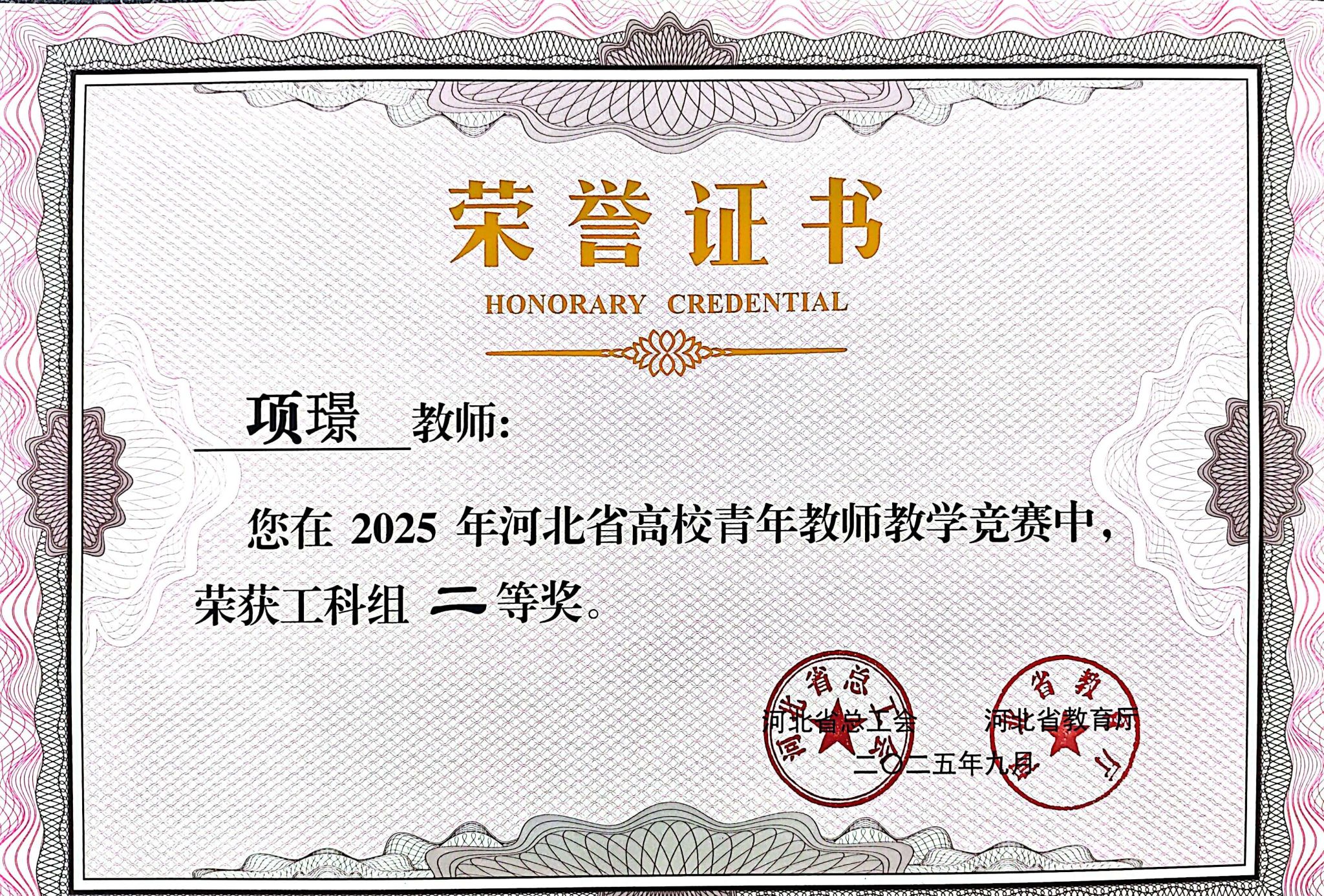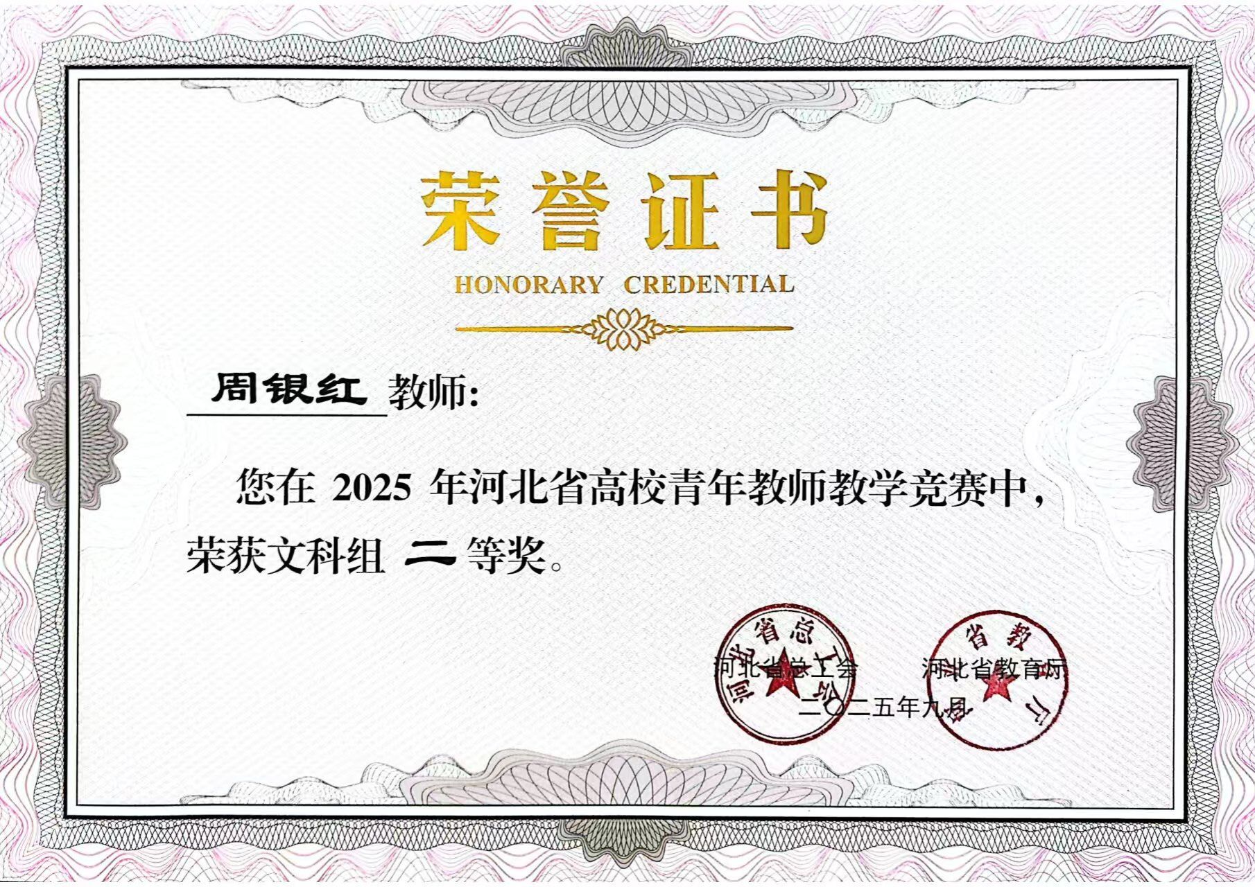 9月30日,河北省高校青年教师教学竞赛在石家庄职业技术学院圆满落下帷幕。beat365官网经济贸易系周银红老师、电气自动化系项璟老师,分别在文科组、工科组双双斩获二等奖。这是beat365官网首次在该省级权威赛事中实现文、工两个学科组别奖项的“双线突破”,充分展现了学校青年教师队伍的综合素养与教学实力。
