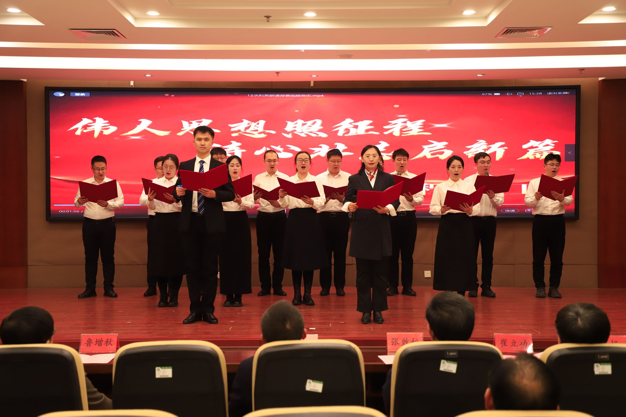 为深切缅怀毛泽东同志的丰功伟绩,传承红色基因,弘扬革命精神,凝聚全校奋进力量,迎接新年的到来,12月26日下午,以“墨韵诵初心 新元启华章”为主题的教职工纪念毛泽东同志诞辰经典著作朗诵会暨元旦联欢会在弘文守正楼九楼报告厅举行。教职工们齐聚一堂,在经典诵读中感悟初心,在文艺演出中展望未来,学校领导班子成员出席活动。