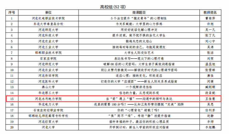 为贯彻落实教育部关于加强学生心理健康工作的相关要求,省教育厅近期组织开展了全省学生心理健康教育优秀成果征集推广活动。经组织专家评审,共评选出学生心理健康大讲堂精品微课84项(中小学组32项、高校组52项);学生心理健康教育工作优秀案例90项(中小学组39项、高校组51项)。beat365官网提交的《四相融通,五育并举:课程-活动-干预一体化心理育人体系构建》获选“河北省学生心理健康教育工作优秀案例”,《当“爱”遇上“懂”——沟通中的倾听与表达》获选“河北省学生心理健康大讲堂精品微课”。