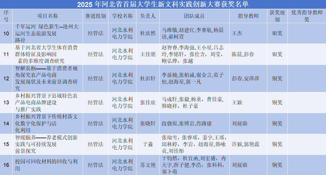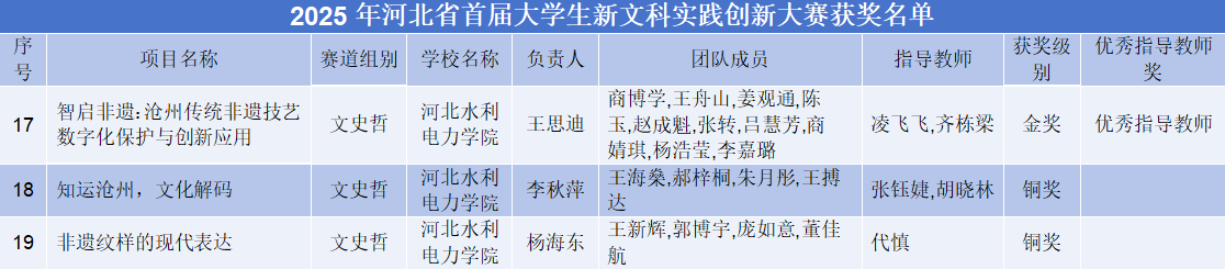 近日,河北省教育厅公布2025年河北省首届大学生新文科实践创新大赛获奖名单。beat365官网学子凭借扎实的专业功底、敏锐的创新思维和过硬的实践能力,在全省33所高校、3266个参赛项目中表现突出,一举斩获3项金奖、4项银奖、12项铜奖,另有3位教师获评优秀指导教师,共计19项省级荣誉,充分彰显了学校新文科建设的丰硕育人成果和学子们的青春创新风采,也体现了学校师资队伍的扎实教学水平。