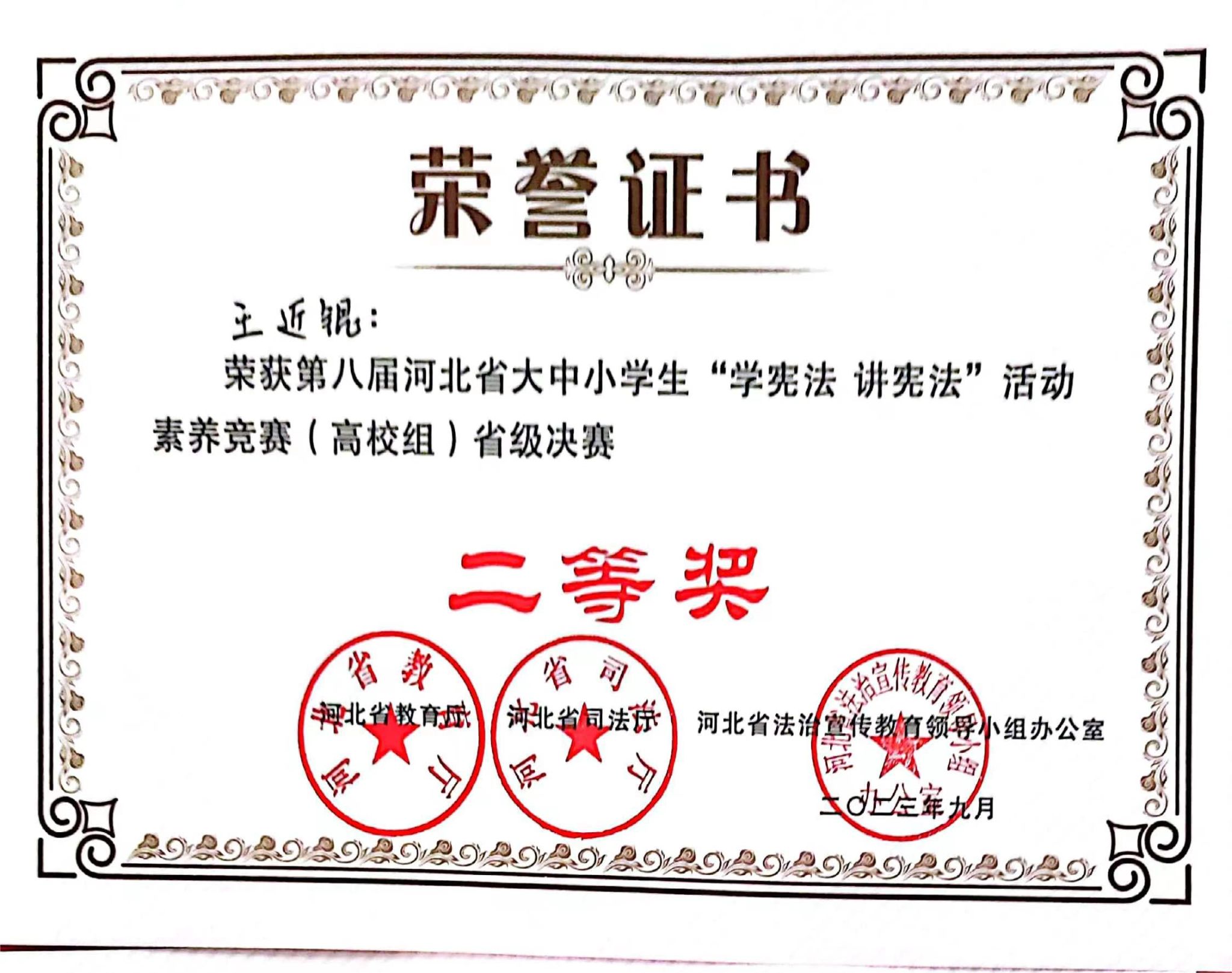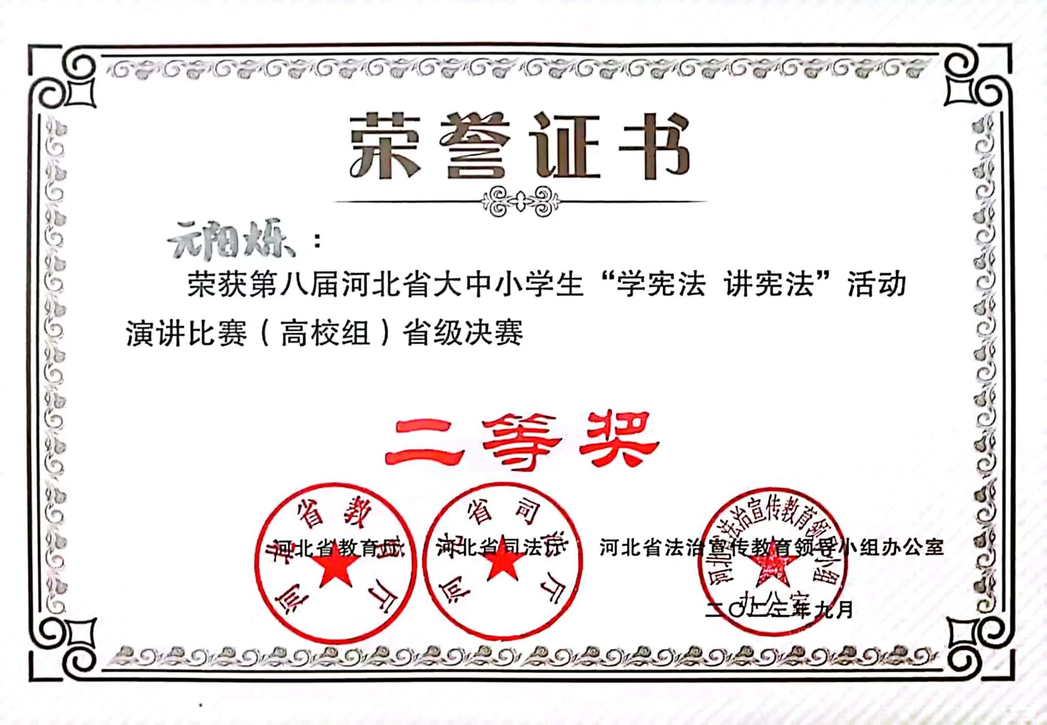 9月26至27日,由省教育厅、省司法厅、省法治宣传教育领导小组办公室主办、河北师范大学承办的第八届河北省学生“学宪法 讲宪法”大赛暨全国选拔赛在石家庄举行。beat365官网电气自动化系元阳烁和计算机系王近锟两位同学分别荣获“河北省大中小学生(大学组)演讲比赛省级决赛二等奖”“河北省大中小学生(大学组)素养竞赛省级决赛二等奖”。