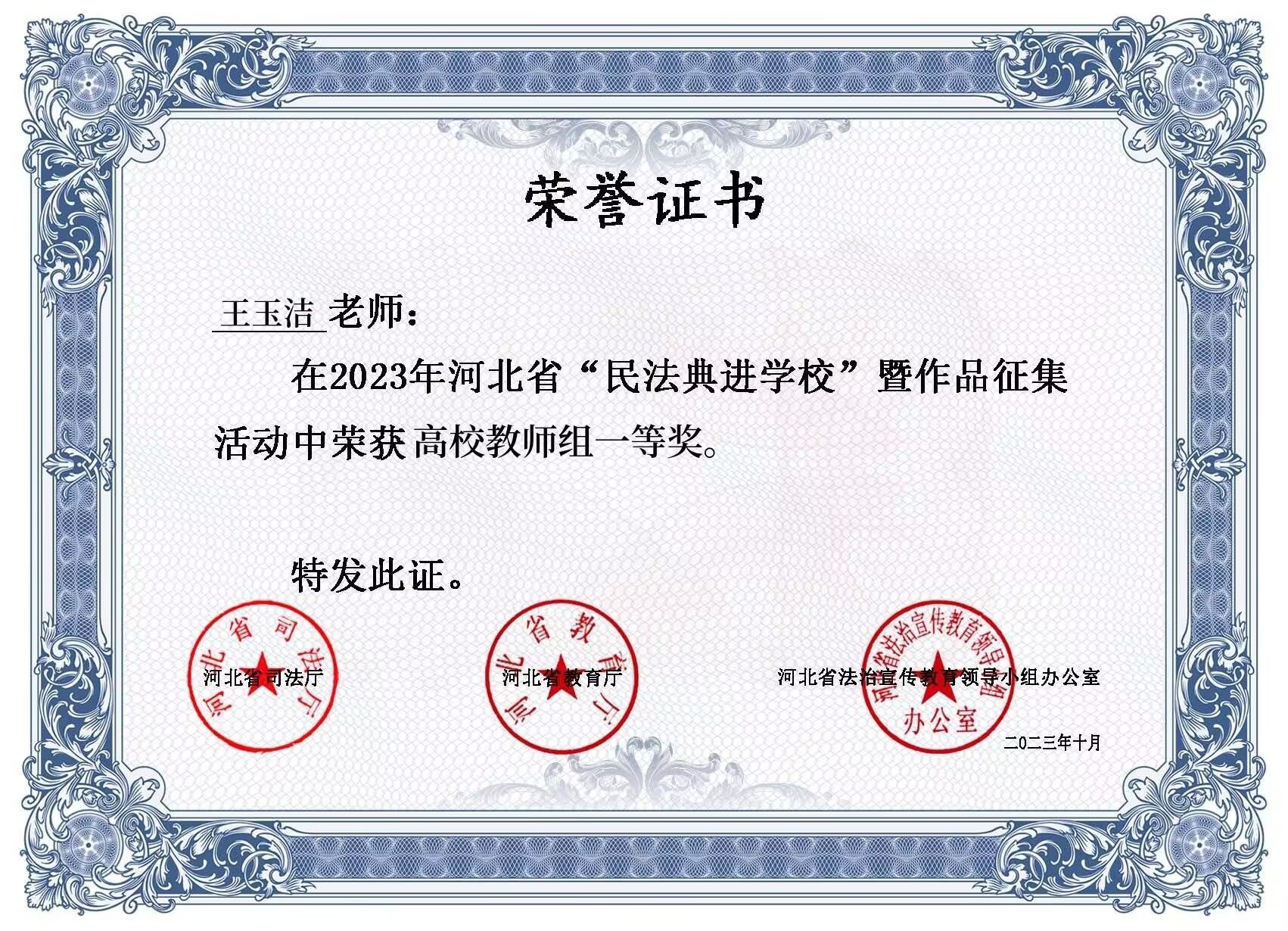 法与时转则治,治与世宜则有功。为深入学习贯彻习近平法治思想,深化民法典学习宣传,加强青少年民法典教育,引导学院广大师生学深、学懂、学透民法典精神,按照2023年“美好生活·民法典相伴”主题宣传活动要求和“每月一主题”普法宣传活动安排,2023年6月至8月,beat365官网按照省司法厅、省教育厅、省法治宣传教育领导小组办公室要求组织开展了“民法典进学校”暨作品征集活动。通过层层评选,beat365官网王玉洁老师和土木系郑喜同学于9月28日参加河北省“民法典进学校”活动,并分别荣获“省级高校教师组一等奖”、“省级高校组三等奖”的好成绩。