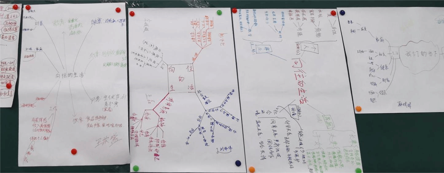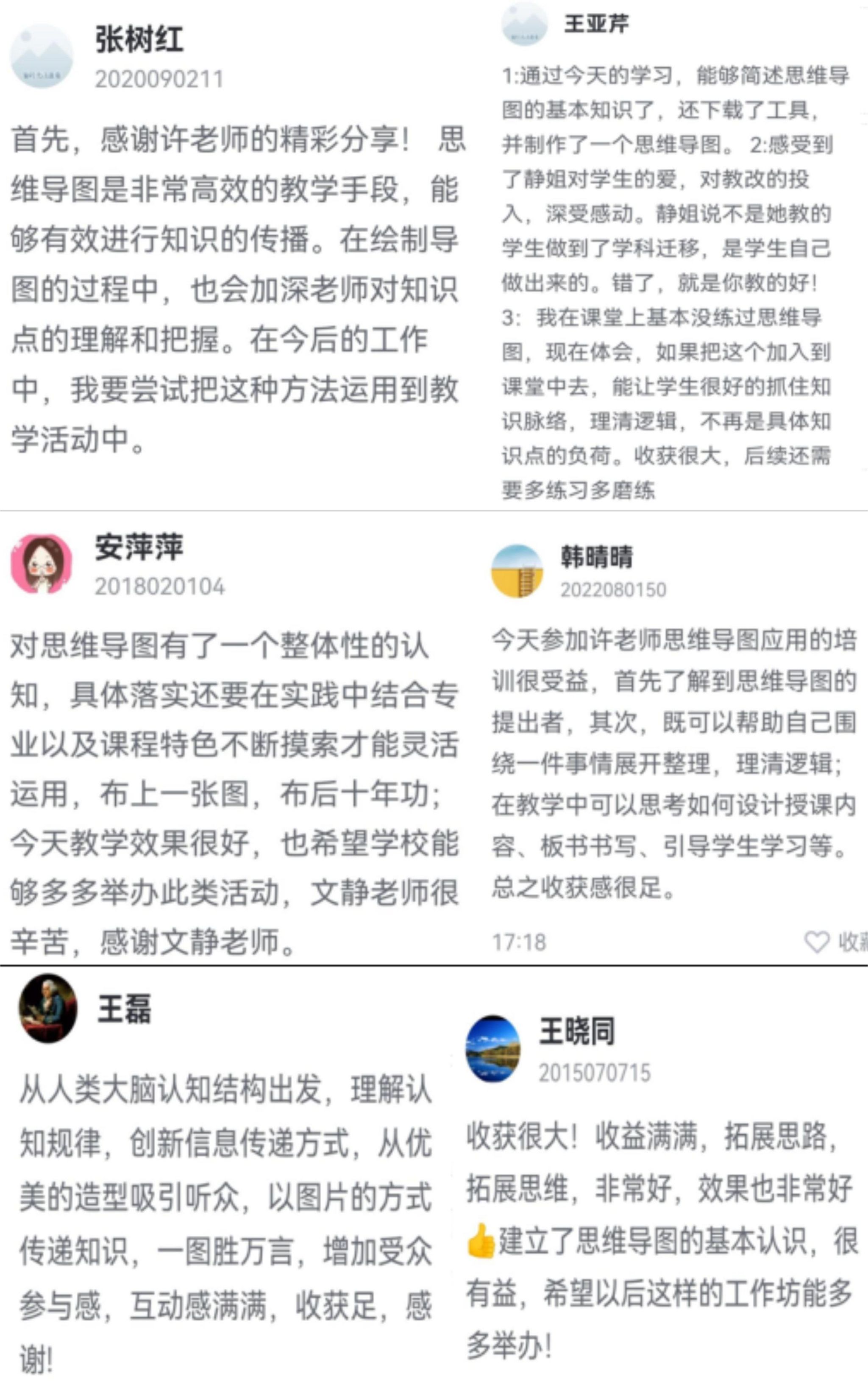 整个工作坊设计精妙、节奏紧凑、内容充实、环环相扣。参培教师在许文静老师的引导下,进行了热烈讨论,通过精心设计、反复推敲、用心绘制,充分体会到思维的发散与聚合,感受到思维导图的魅力。当一幅幅作品呈现在自己眼前时,老师们的效能感、获得感油然而生。