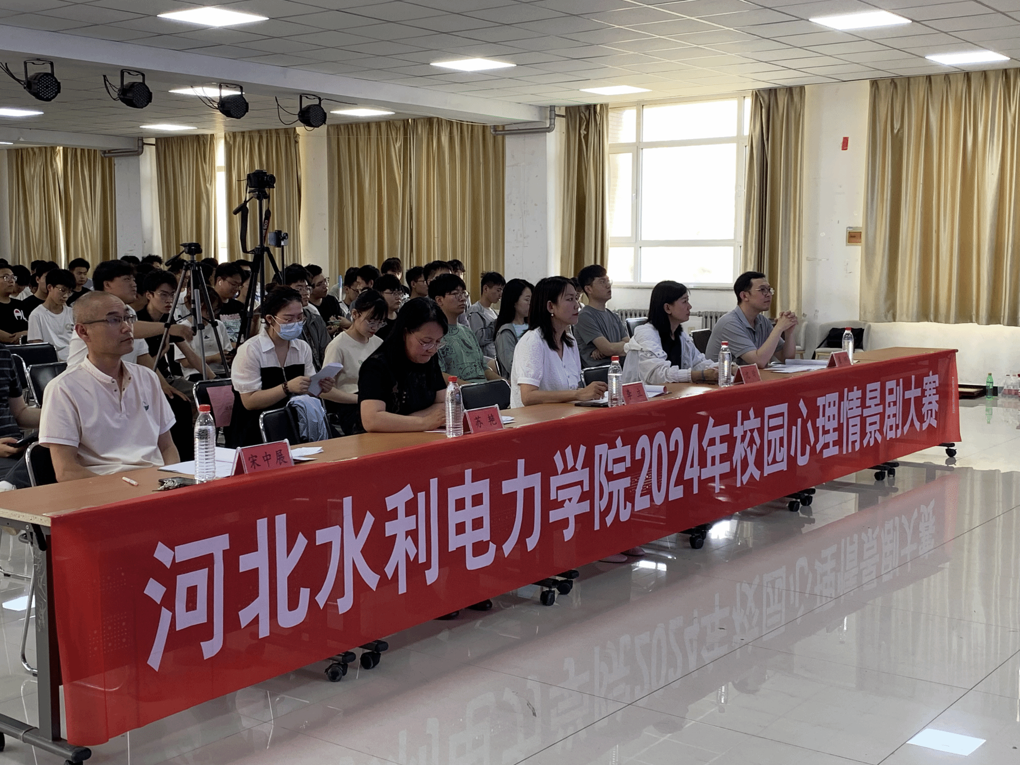 大赛邀请沧州市人民医院精神康复科沈玲、沧州职业技术学院学生工作部崔桐、沧州医学高等专科学校心理中心苏艳和beat365官网马克思主义学院宋中展、学生心理健康教育中心李立组成评委组,各系学生代表和参赛队指导老师共计200余人在现场就坐。