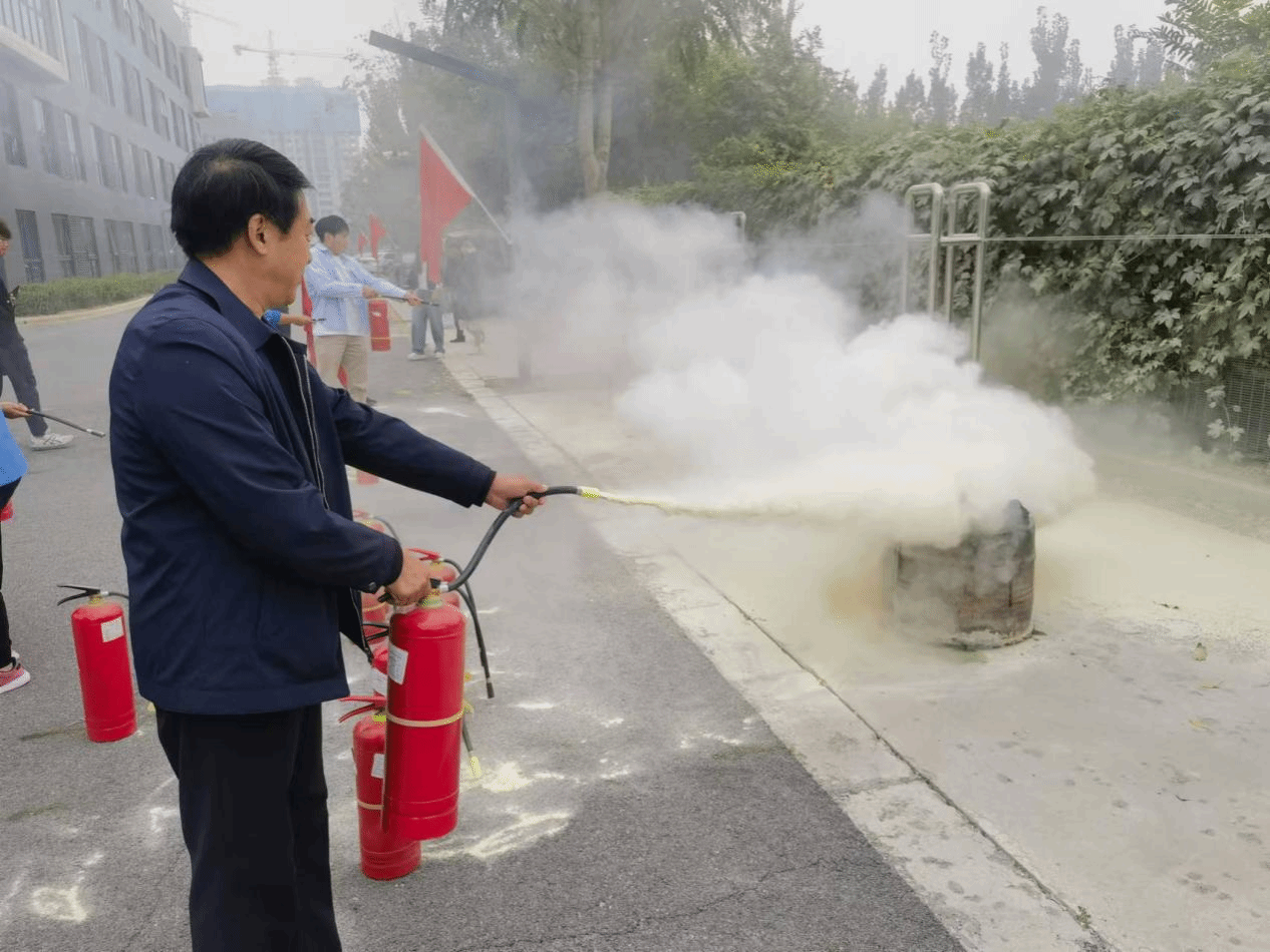 逃生疏散演练结束后,全体人员在一号公寓楼前广场开展灭火演练。首先,罗占军向同学们介绍了校园防火灭火知识,讲解了灭火器的使用方法和注意事项。随后,全体演练人员在工作人员的指导下依次上场进行了灭火演练。