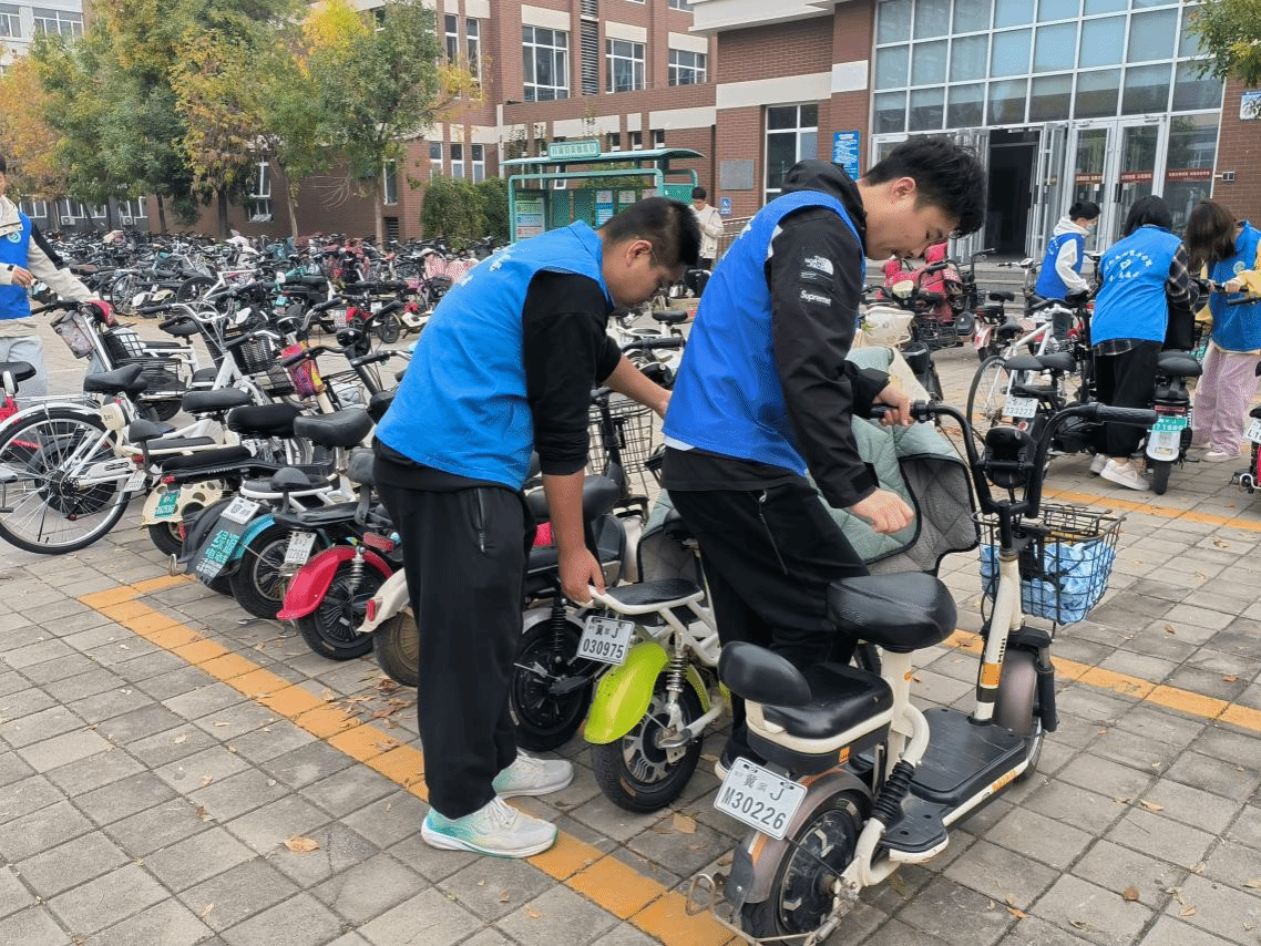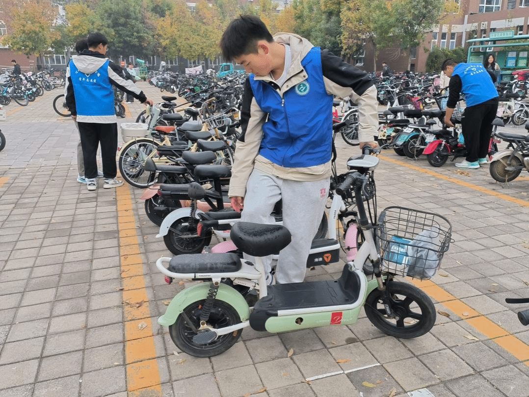 活动中,八十多名师生志愿者用两个小时的时间将一辆辆车按照标线方向车头朝里、车尾对齐非机动车车位外标线,垂直整齐摆放在非机动车位上,并告知正在停放电动车的同学按此标准停放。在大家的共同努力下,全校非机动车整齐划一停放在非机动车车位里,打造出了一道美丽的风景线。
