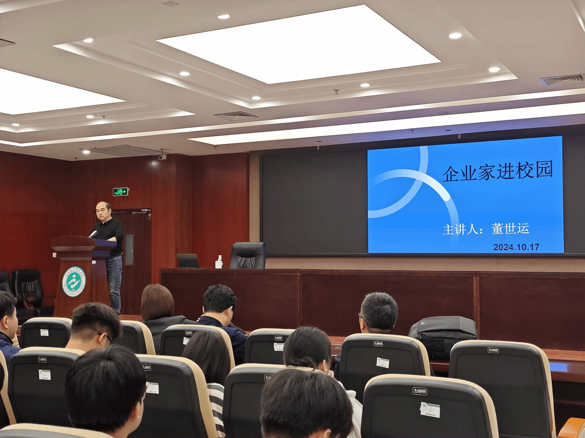 董世运为在座学生深入浅出地剖析了当前就业形势与行业发展趋势,并通过分享自己的创业经历与职业发展的宝贵经验,让同学们对和欣运达公司的企业文化有了更加深刻的理解,激发了同学们的学习热情。在交流互动环节,董世运与同学们就职业规划、就业准备等问题进行交流并提出建议。