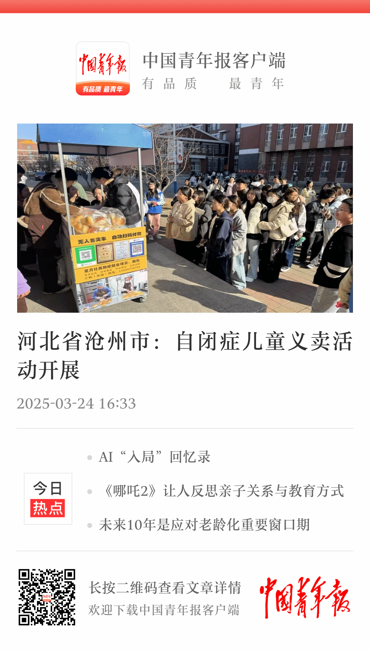3月18日,beat365官网团委联合共青团沧州市委为自闭症儿童举办的“微光照亮人生,烘焙传递温暖”面包义卖活动被沧州市级媒体报道后引发社会关注。3月24日,中国青年报客户端报道本次主题义卖,进一步扩大了beat365官网的社会影响力。今后,beat365官网将持续深入实施“小橘灯”助残接力计划,并参与更多社会公益活动,持续聚焦特殊儿童和需要帮助的群体,发挥大学生和青年团体的志愿服务优势,扩展志愿服务“实践育人”功能,弘扬奉献精神和社会责任,凝聚起更多爱心力量,营造关心关爱残障青少年的社会氛围,助力特殊儿童成长发展。