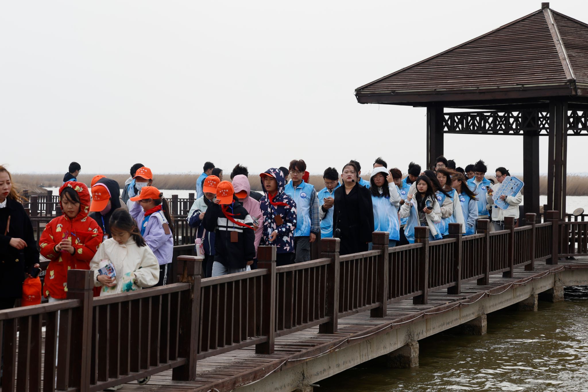 清晨的南大港湿地薄雾缭绕,研学队伍在湿地保护区工作人员引导下开启探索之旅。工作人员结合潮间带地貌特征,以芦苇根系展示湿地过滤功能,用贝壳沉积层讲述海陆变迁史,生动阐释滨海湿地“地球之肾”的生态功能,将抽象的生态学原理转化为可触可感的生态密码。