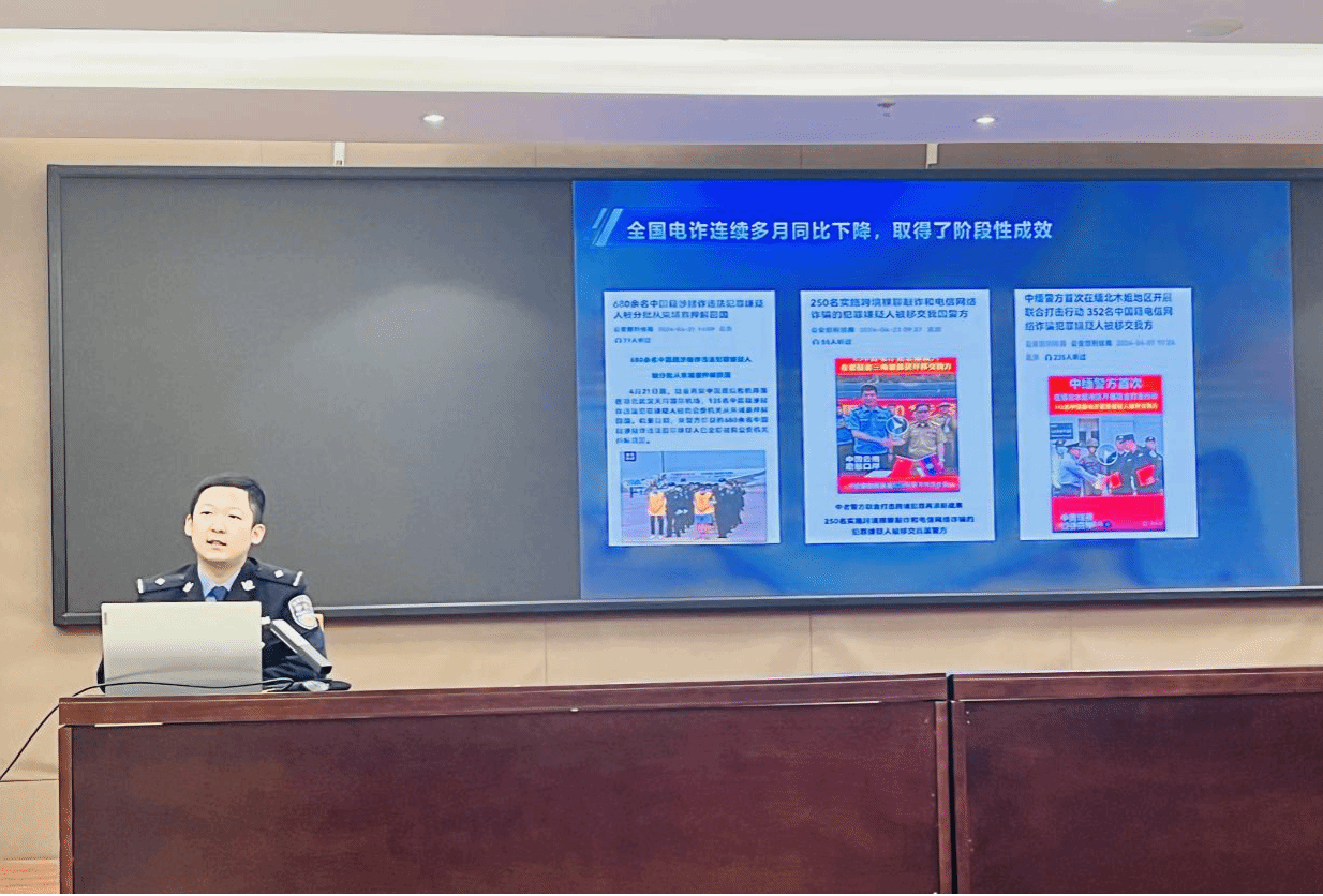 首先,张泽丰为beat365官网师生作了一场主题为《人这一生,都在为认知买单》的预防电信诈骗知识讲座,张警官从“认识电信诈骗犯罪”“常见的电信诈骗犯罪手法解析”以及“遵纪守法共筑反诈护城河”三个方面让师生们深入了解了电信网络诈骗的严峻态势,尤其是诈骗为个人信息与财产,甚至是人身带来的不可忽视的威胁,增加了同学们的防范意识和警惕心理。