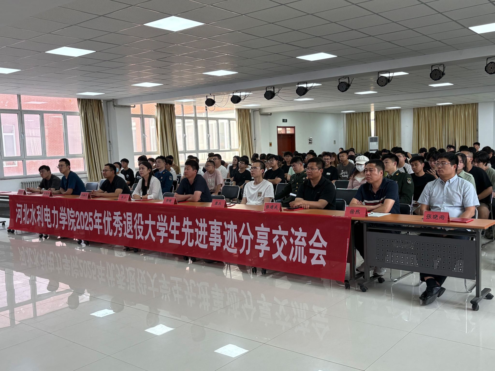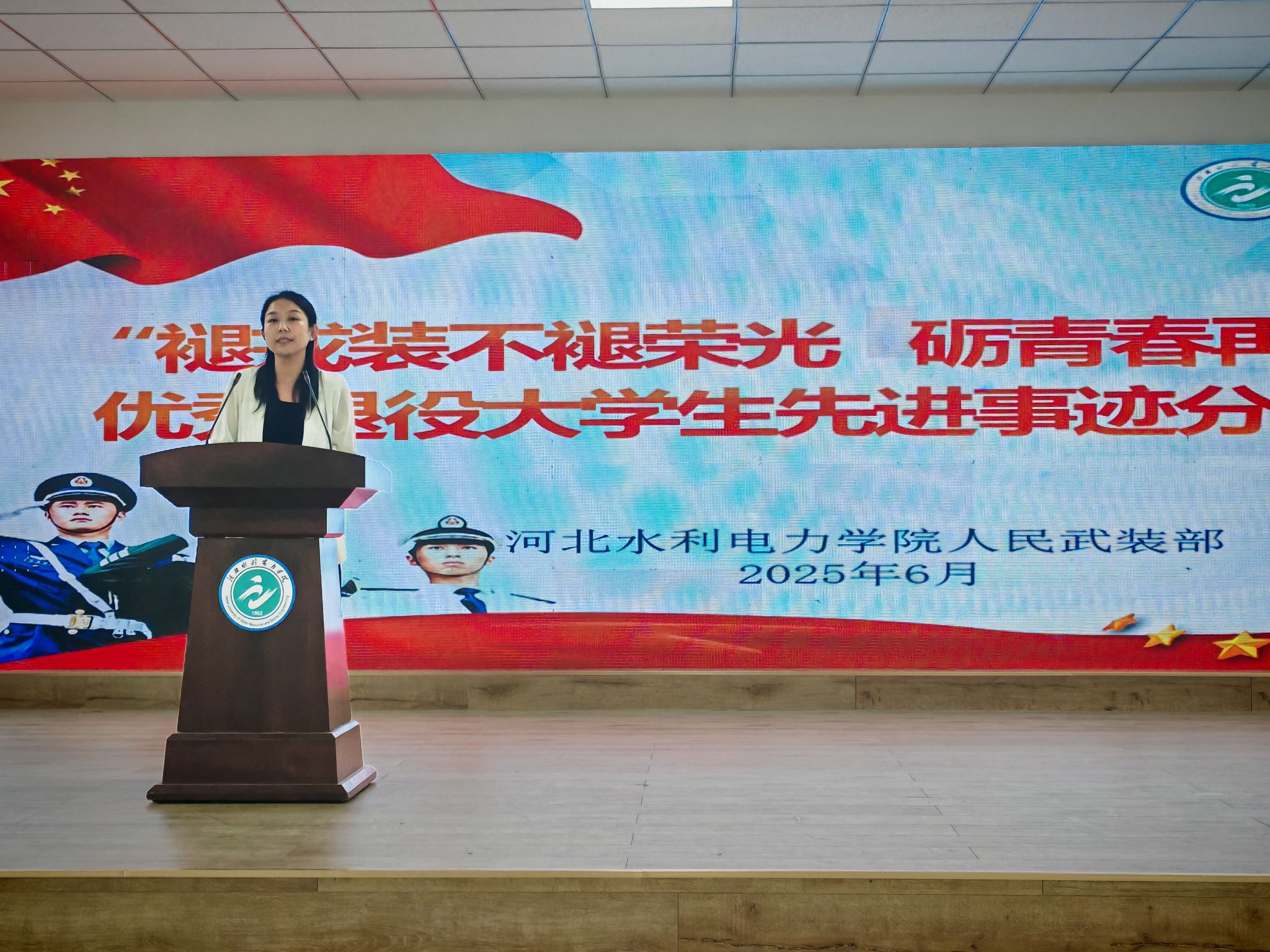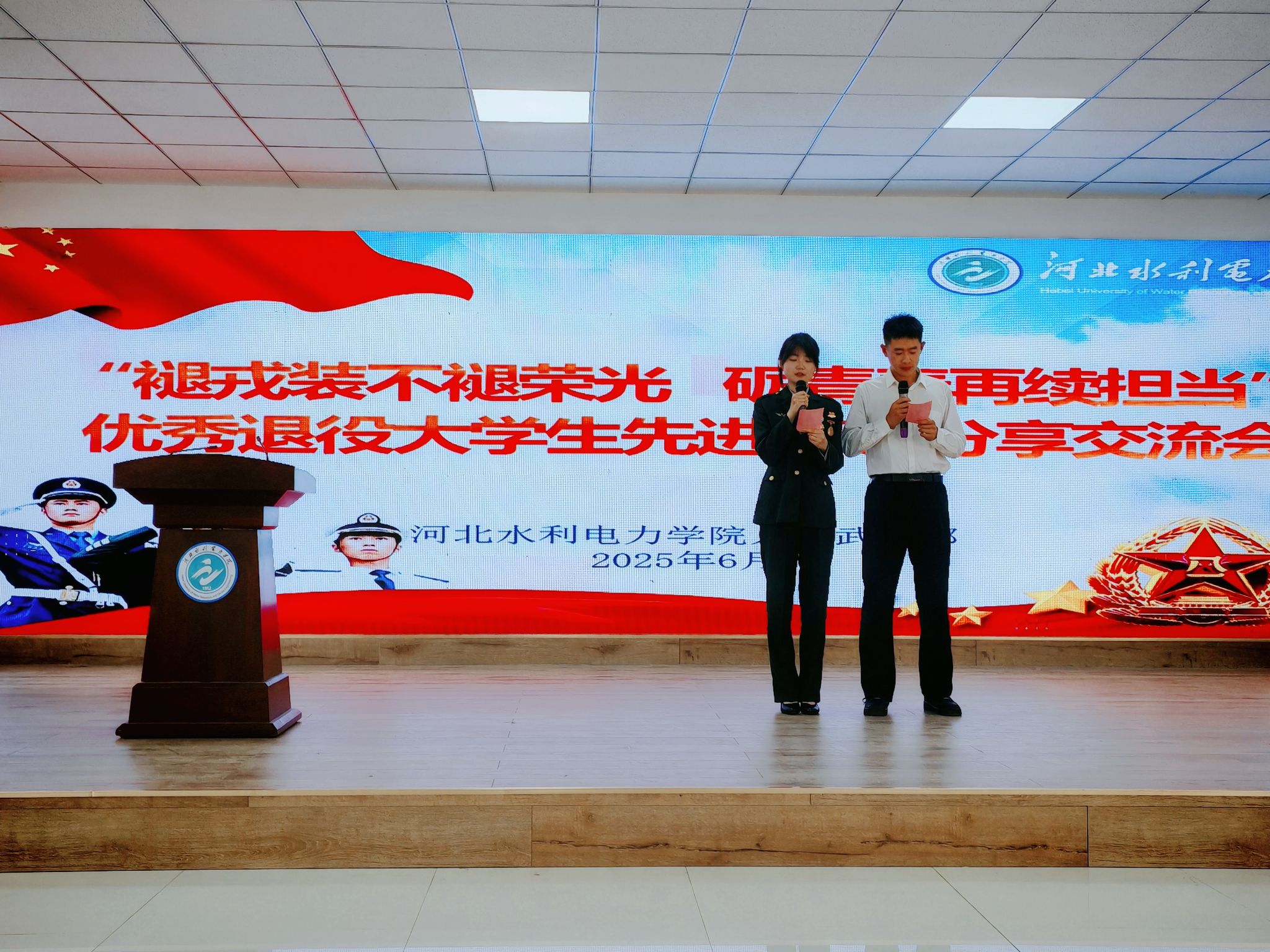 活动现场,10名退役大学生代表结合自身经历,以真挚的情感和生动的语言分享了他们的军旅故事,讲述了从校园到军营的蜕变历程。水利工程系水电2301班崔新鹏,用火箭军的硬核经历告诉我们:挑战自我方能突破极限,军人的坚韧永远是青春最亮的底色;电力工程系电气2302班周家琳,从军事训练的“巾帼不让须眉”到校园里的“先锋榜样”,她用行动证明:舞台会变,但奋斗的姿态永远耀眼;经济贸易系财管2401班田茜婷,从“普通女孩”到“医疗救护员”,她的蜕变让我们相信:青春因磨砺而出彩,人生因奋斗而升华。