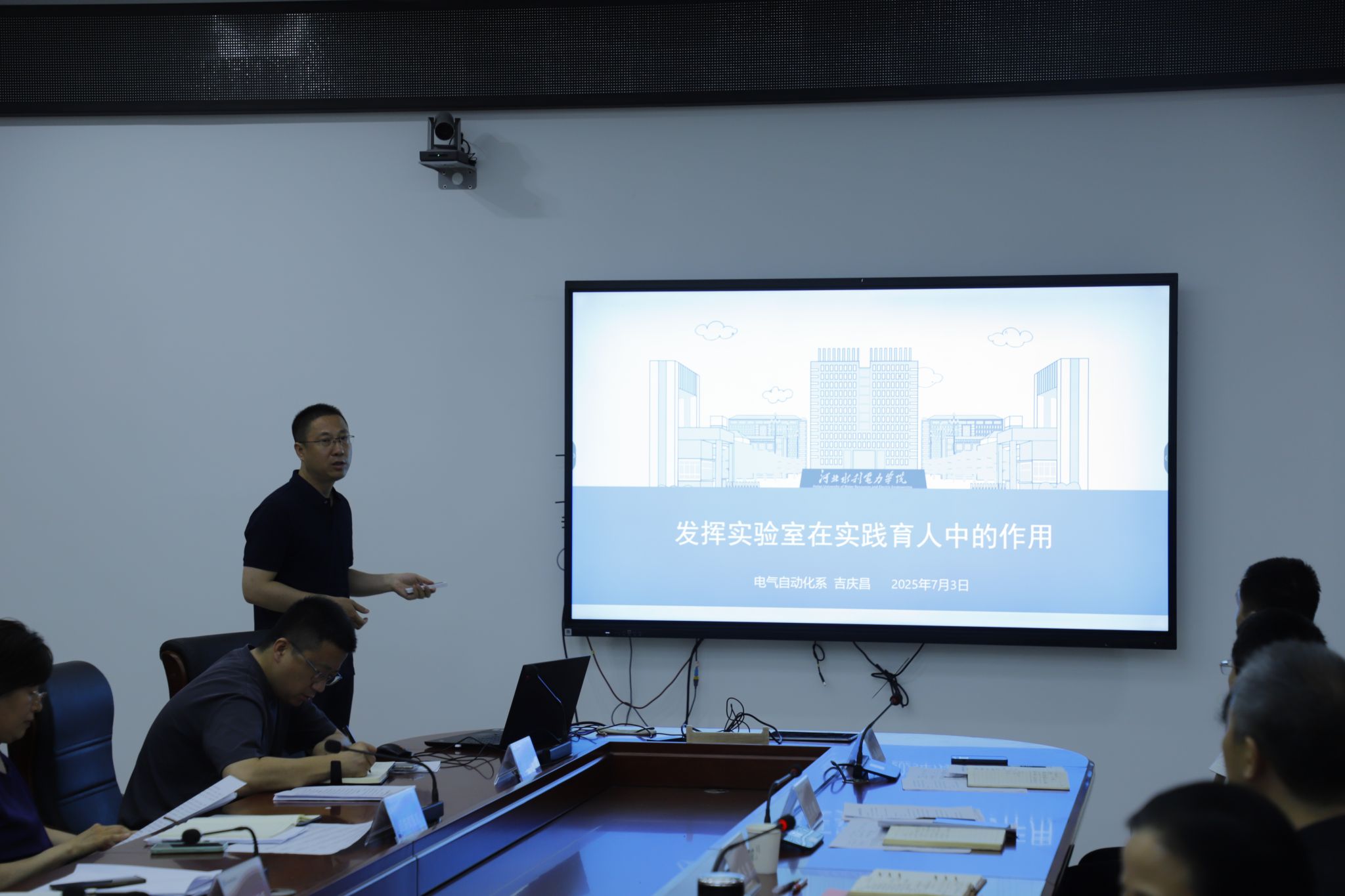 会上,基础部主任王侠围绕“通专融合,基础课程服务专业建设”主题作汇报,分享了通过课程模块化重构、教学内容案例化设计,将数学、物理等基础课程与专业核心知识有机衔接的经验。电气自动化系副主任吉庆昌以“发挥实验室在实践育人中的作用”为题,系统阐述了优化实验室开放机制、开发项目式实践教学资源、深化校企协同育人等提升学生工程实践能力的创新举措,为教学改革提供了新思路与实践样板。