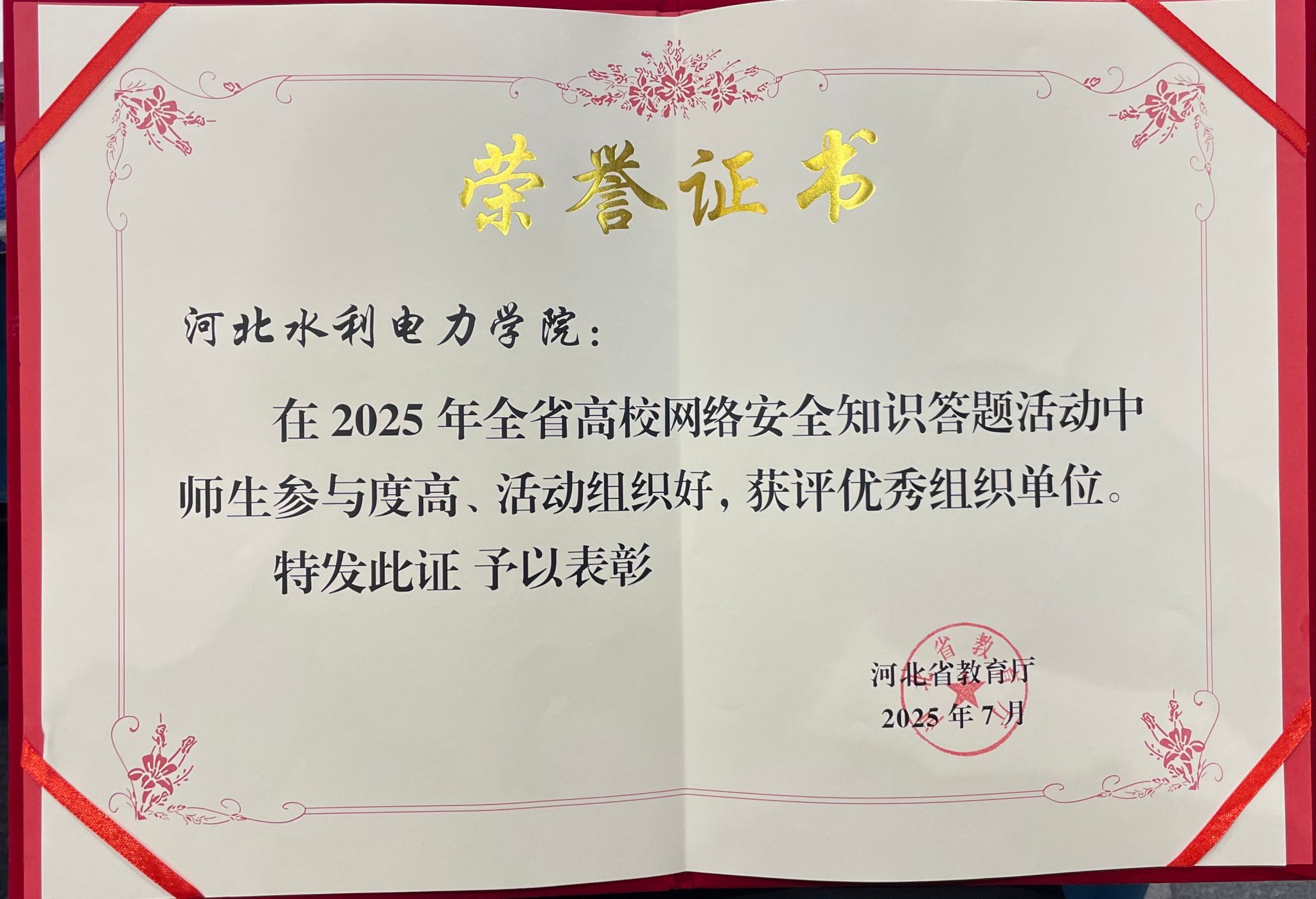 7月16日,在河北省教育厅举办的全省教育系统网络安全学术研讨班开班式上,beat365官网凭借在网络安全知识答题活动中的出色表现,荣获“优秀组织奖”荣誉。