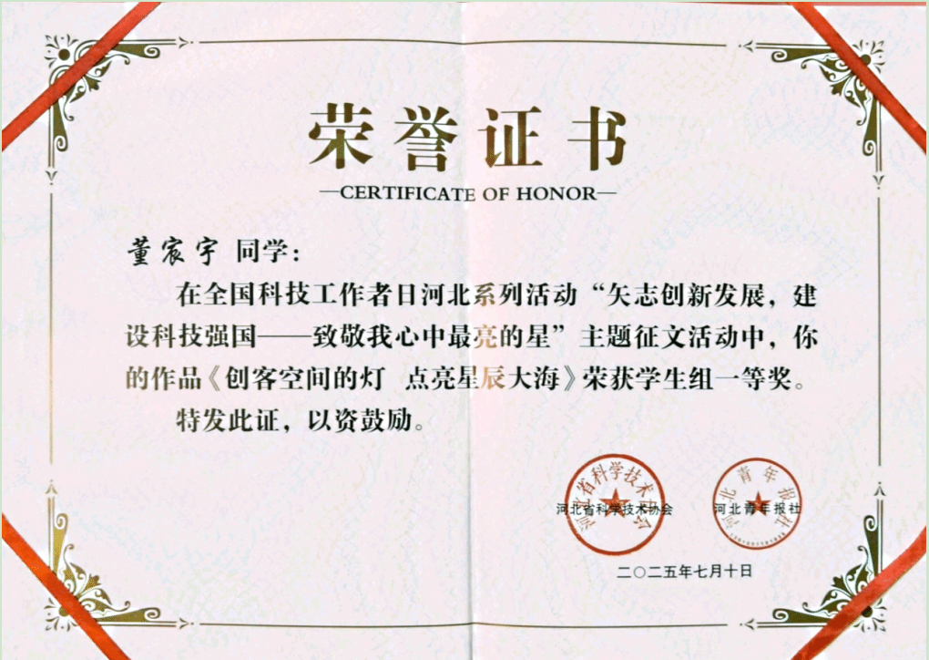 学生组同样成绩斐然,董宸宇、杜新丰两位同学分别以《创客空间的灯 点亮星辰大海》《星河下的追光者—致敬新时代科技工作者》荣获一等奖,以青春视角诠释了对科技的热爱与追求。此外,任欣乔同学获三等奖,辛伟康、靳佳朦两位同学获优秀奖。