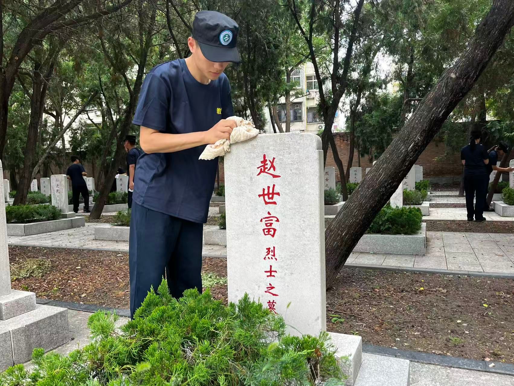 随后,全体人员分组有序开展清扫卫生、擦拭烈士墓碑工作。同学们细致清理着墓区的落叶与杂物,轻柔擦拭墓碑上的灰尘,每一个动作都饱含对先烈的敬仰之情,用实际行动守护英烈安息之地。