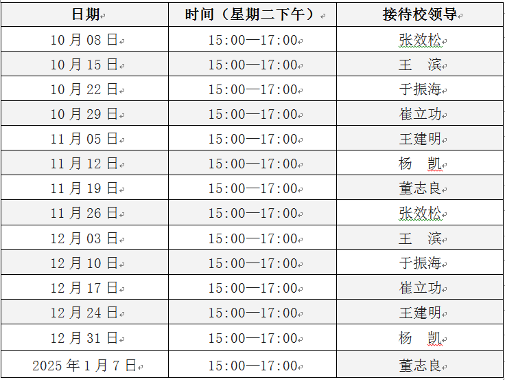 为进一步做好群众工作,方便师生来访,密切学校领导与广大师生员工的联系,畅通学校内部信息沟通渠道,现将本学期校领导信访接待日安排予以公布: